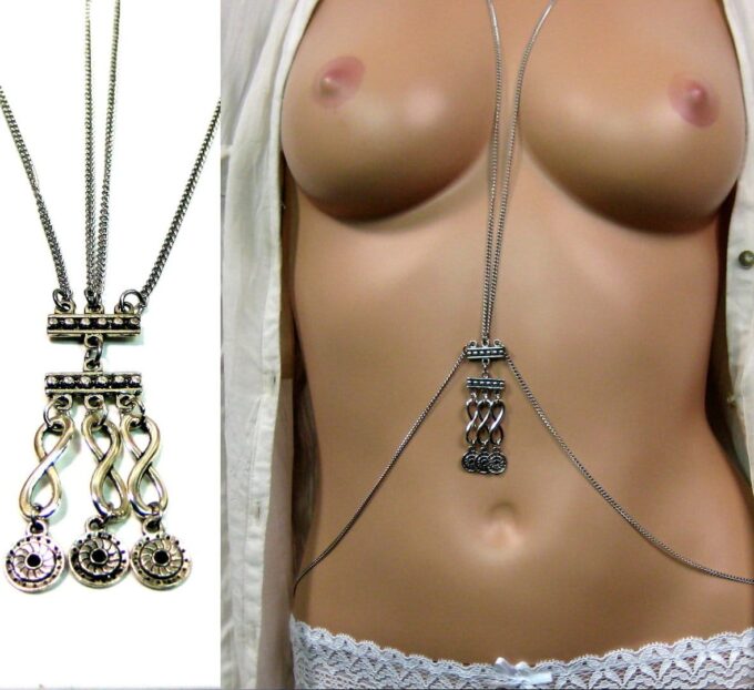 Chaine corps ethnique femme Acier inoxydable argent composée d’un pendentif rectangulaire en métal argenté monté sur une chainette en acier inoxydable; Dim du pendentif : 5,5 X 3 cm. Fermoir mousqueton. Longueur totale (fermoir compris): 90 cm env. Longueur du collier : 90 cm. Longueur de la taille (fermoir compris) : 90 cm env. Taille unique. Livré dans sa pochette d’organza. Bijou 100% fait-main. Poids : 22,4 g