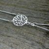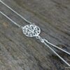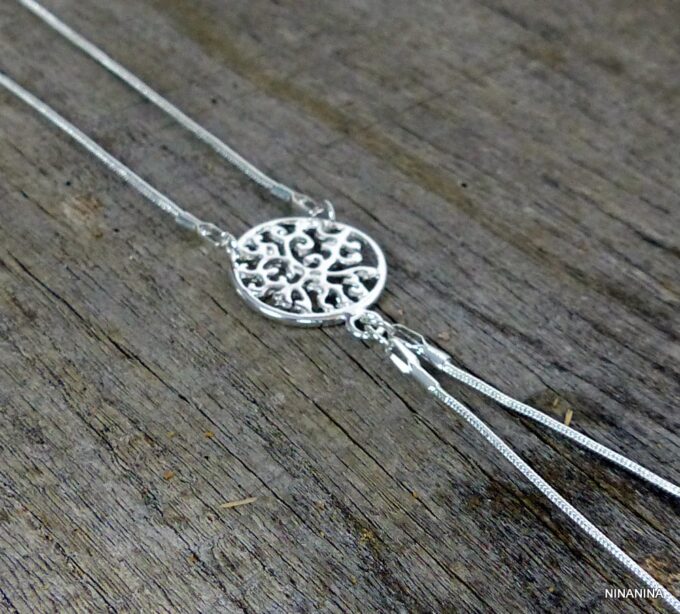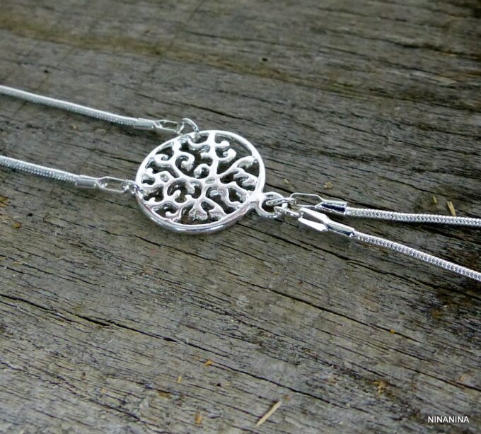 Chaine de corps Argent plaqué rosace filigranée composée d’une entretoise filigranée en plaqué argent montée sur une chaînette serpent en plaqué argent. Fermoir mousqueton . Diamètre de l’entretoise : 1,8 cm. Longueur du collier : 60 cm. Longueur de la taille (fermoir compris) : 120 cm env. Taille unique. Livré dans sa pochette d’organza. Bijou 100% fait-main. Poids : 18,2 g