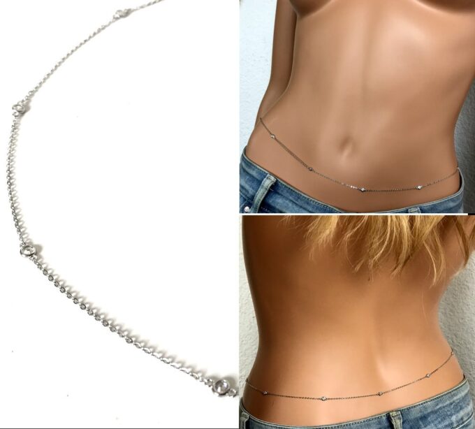 Cette magnifique Chaîne de hanche or plaqué argent oxyde de zirconium sexy et raffinée ne vous décevra pas! Des petits oxydes de zirconium blancs délicatement répartis sur une chaine en argent 925 plaqué or 9 carats, cette chaine de ventre ne demande qu’à mettre en valeur les courbes de votre corps, suscitant sensualité et volupté. Elle est terminée par un délicat fermoir rond à ressort, facile d’utilisation et d’une chainette de réglage qui vous permettra de porter la chaine à différentes hauteurs de votre ventre.