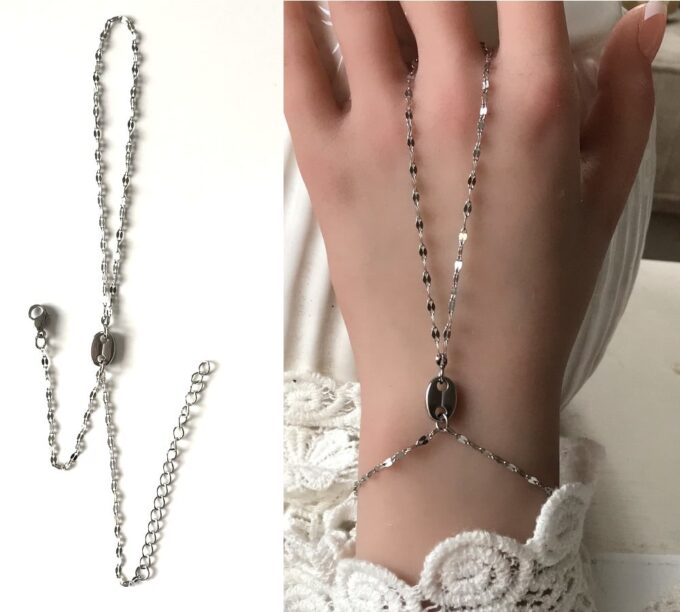 Craquez assurément pour cette superbe  Chaîne de main grain de café Acier Inoxydable argenté ! Un bijou féminin très fin et très tendance composé d’un motif ovale possédant deux trous centrés monté sur une chaînette fantaisie discrète et raffinée aux maillons en forme de grain de café, formant un bracelet relié à une chainette formant la bague. Assurément un beau cadeau à offrir ou se faire offrir!