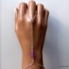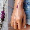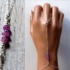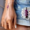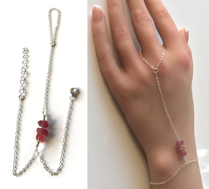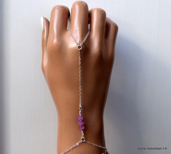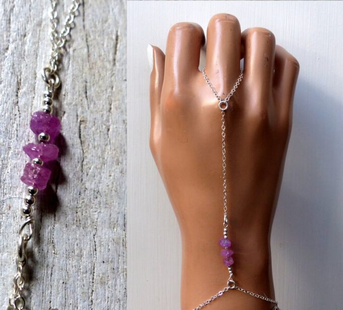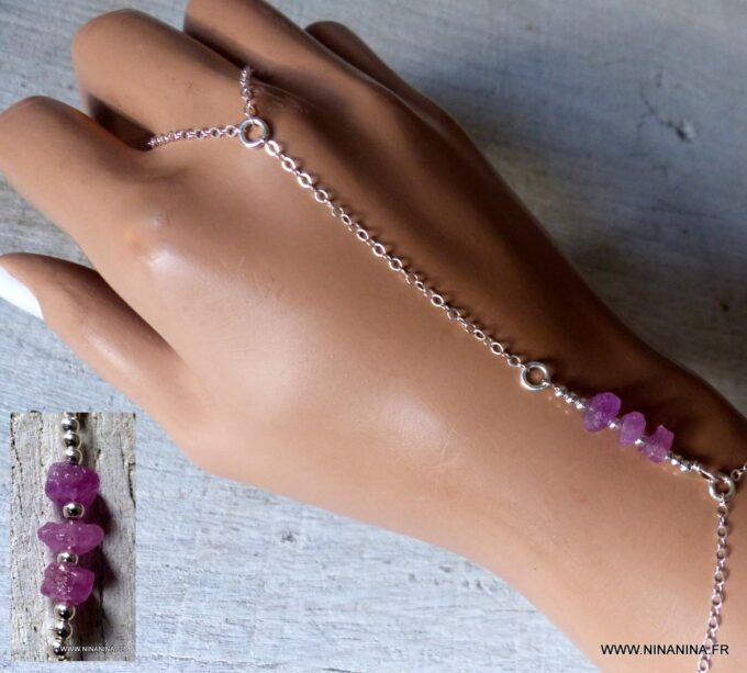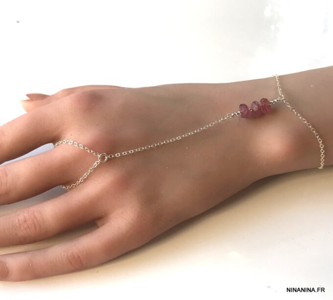 Splendide, délicat et raffiné, cette Chaine de main Saphir rose et Argent 925 massif apportera douceur et lumière à votre poignet. Il composé d’un bracelet (au niveau du poignet) relié à une bague par une chainette en argent 925 qui affine le tout… De petites pépites en saphir rose brut feront briller de mille feux le dos de votre main. Un bijou en pierre précieuse et très original qui délivre toute sa finesse, et vous fera tout simplement craquer !