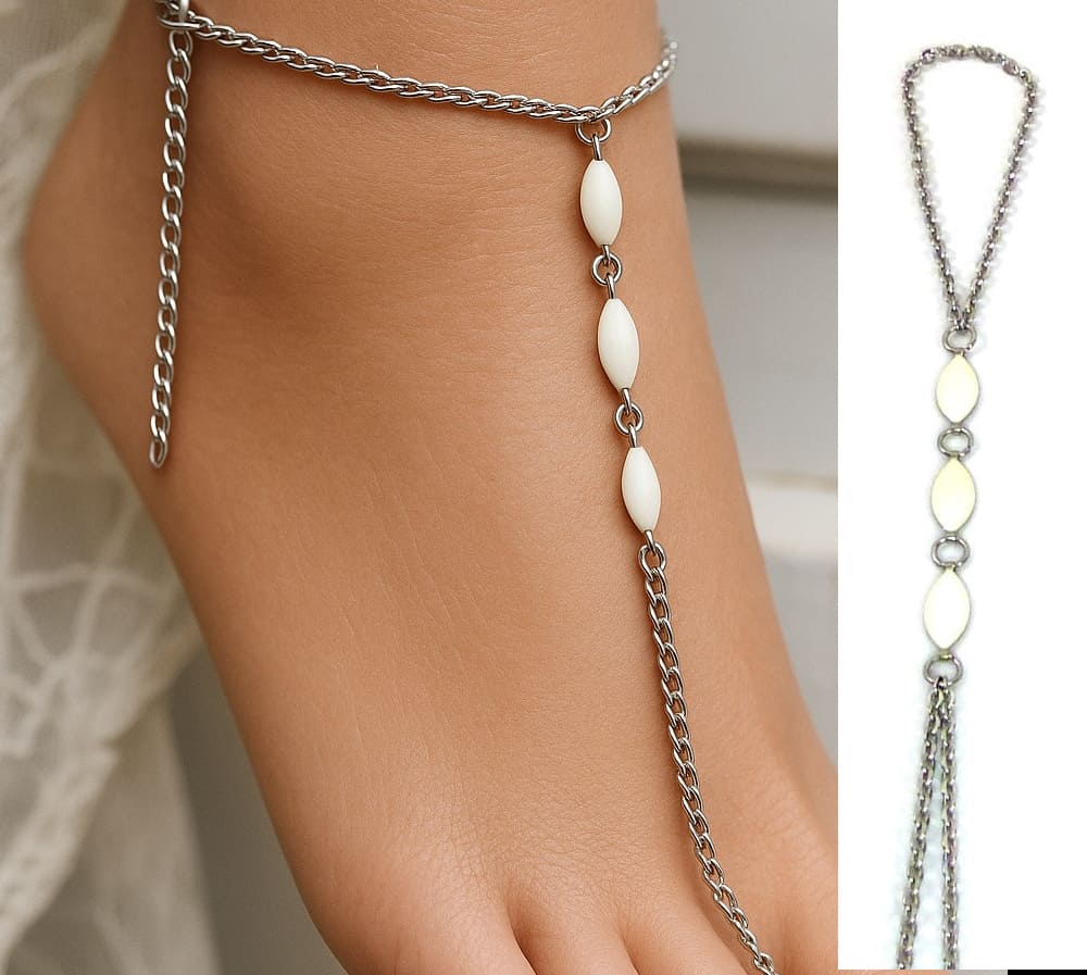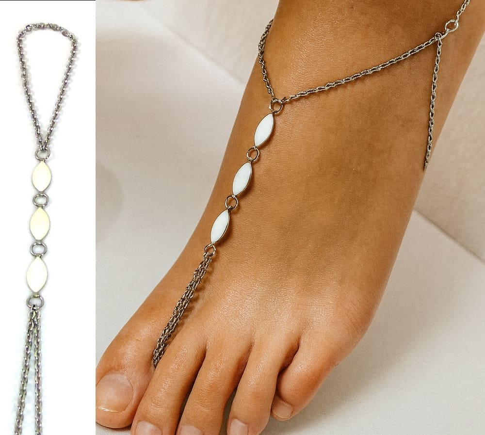 Cette Chaine de pied femme Acier inoxydable losanges blancs composée de 3 entretoises ovales en acier inoxydables émaillées blanches montées sur une chainette en acier inoxydable habillera les chevilles les plus fines comme les plus fortes et possède tous les attributs qui souligneront la sensualité de vos pieds! Cette Chaîne de pied est terminée par un délicat fermoir mousqueton en acier argenté, sûr et facile d’utilisation et une chainette de rallongement réglable pour un ajustement parfait.