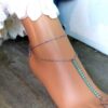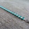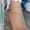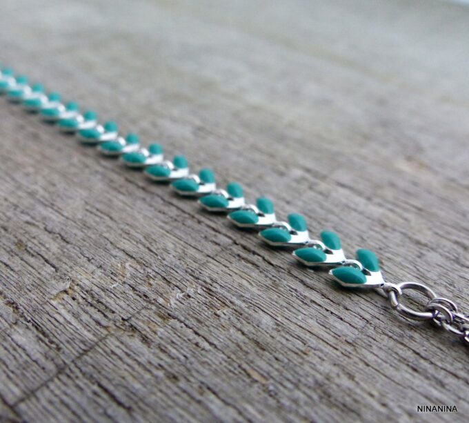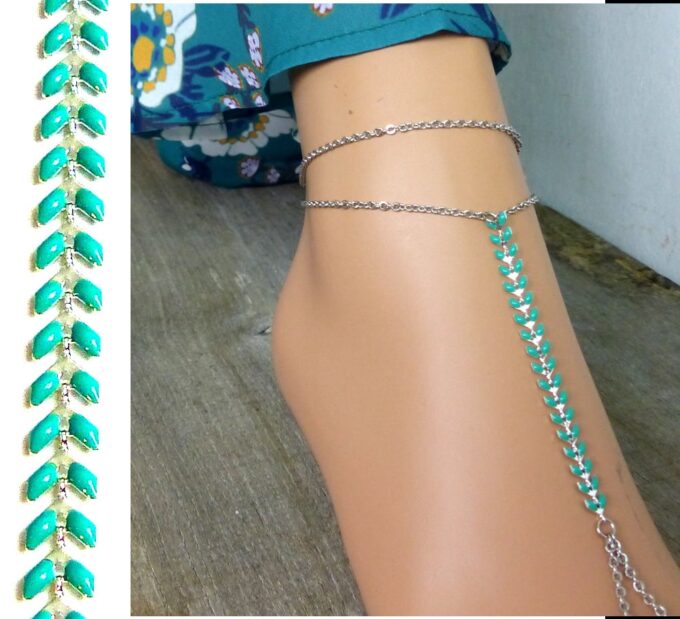 Chaine de pied acier inoxydable émaillée turquoise composée d’une chaine épi en métal argenté turquoise émaillée montée sur une chainette en acier inoxydable, à enrouler autour de la cheville. longueur de la chaine épi : 8 cm. Fermoir mousqueton et chainette de rallongement. Longueur (fermoir compris) : 47 cm env + 6 cm chainette rallongement. Livré dans sa pochette d’organza. Bijou 100% fait-main.