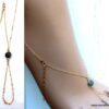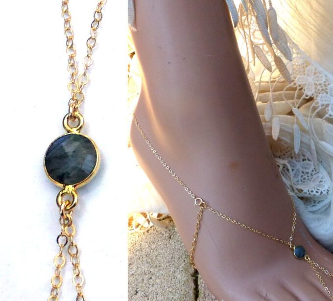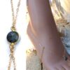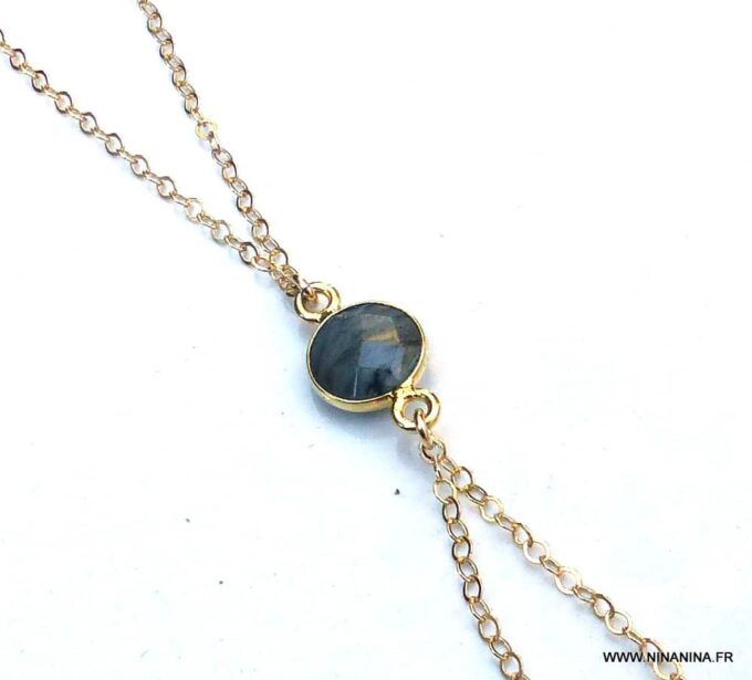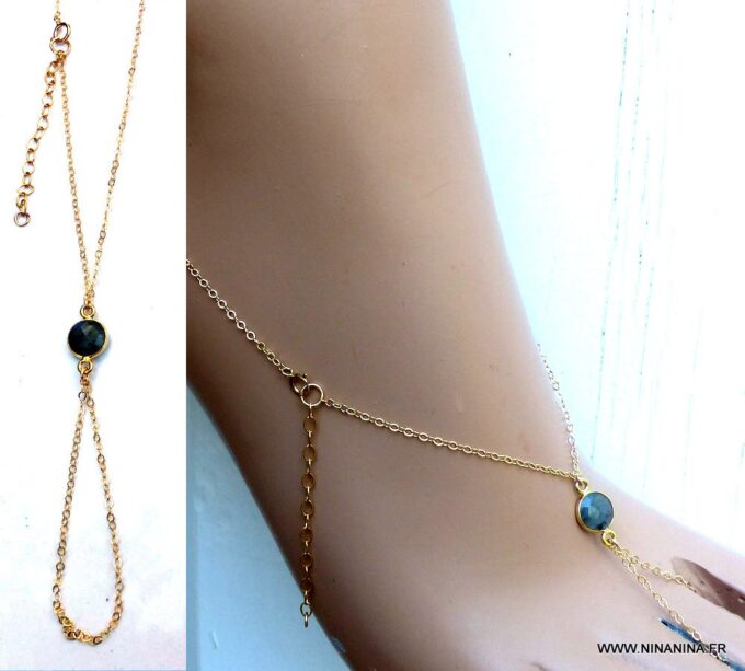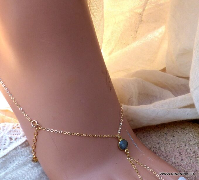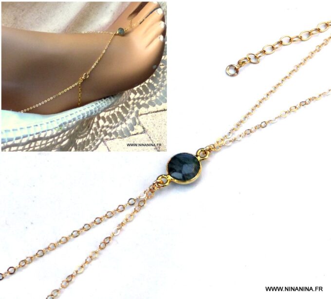 Chaine de pied pierres fines labradorite plaqué or composée d’un motif central en labradorite naturelle monté sur une chaîne en plaqué or 18 carats.