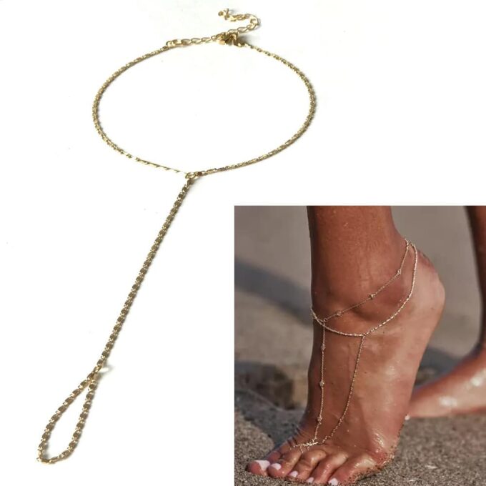 Cette chaine de pied s’enfile à un orteil, court sur le pied et s’attache autour de la cheville.