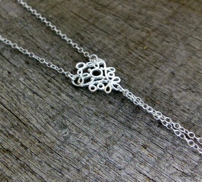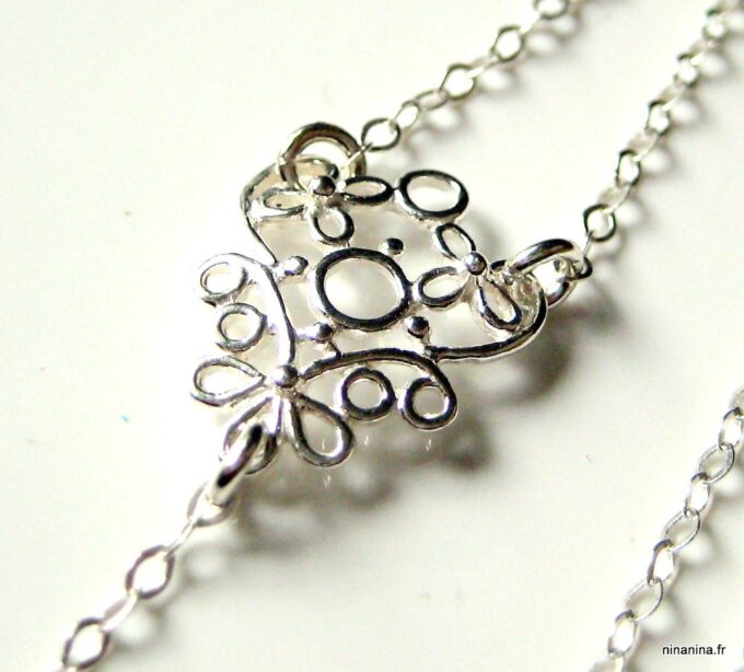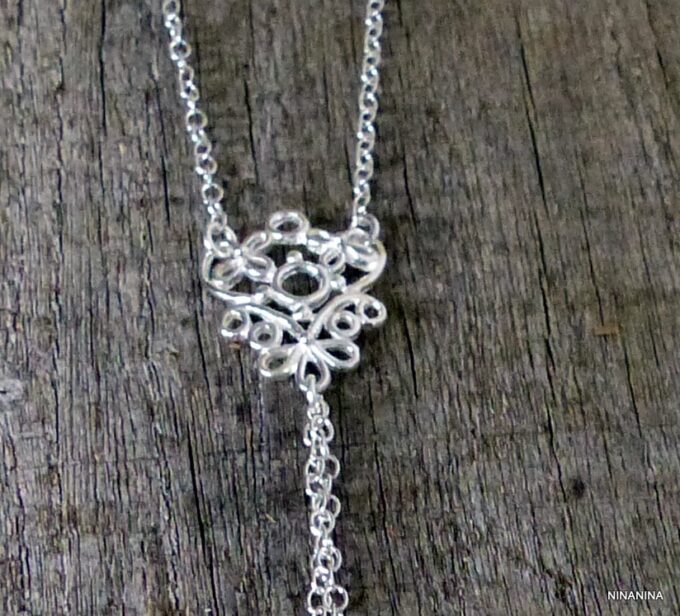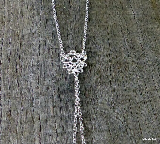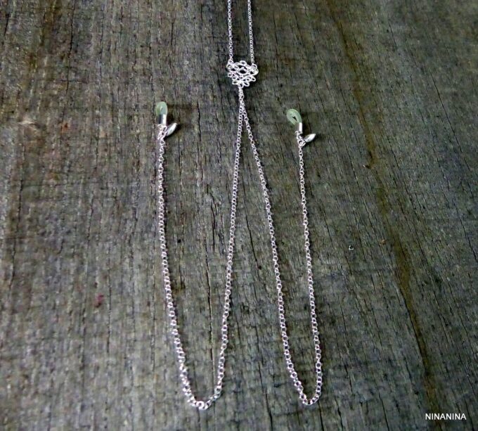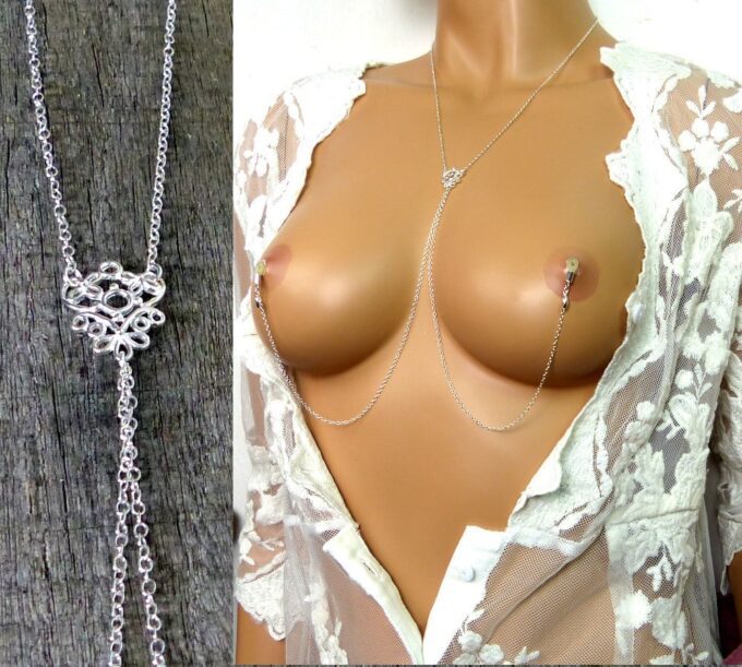 Chaine de seins – Bijou de corps sexy argent 925 composée d’une estampe filigranée et de deux petites perles ovales en argent 925 montée sur chainette en argent 925 et terminée par deux embouts en silicone.