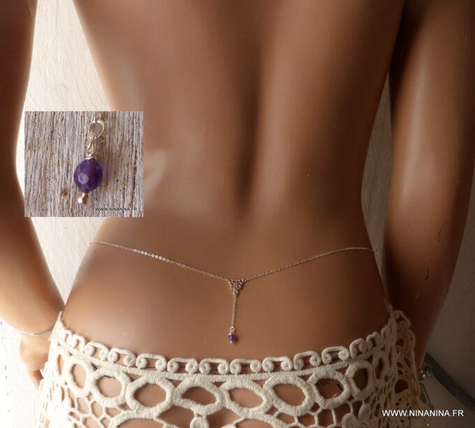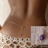 Ajoutez une touche de sensualité à n’importe quelle tenue avec cette Chaine de ventre Argent 925 massif Et perle améthyste constituée d’une petite pierre en améthyste montée sur une Chaîne en Argent 925. Cette Chaîne de taille, aussi appelée chaine de ventre ou chaine de hanches, est terminée par un fermoir mousqueton.