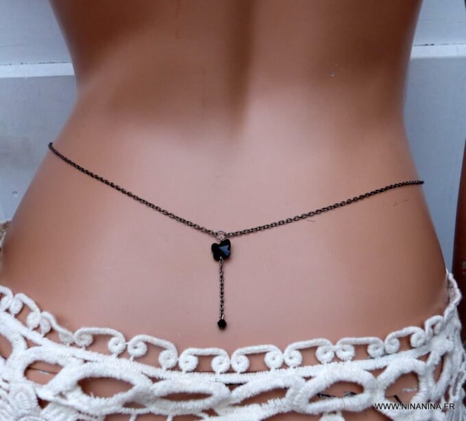 La chaine de taille est disponible avec un papillon Swarovski bleu turquoise ou gris.