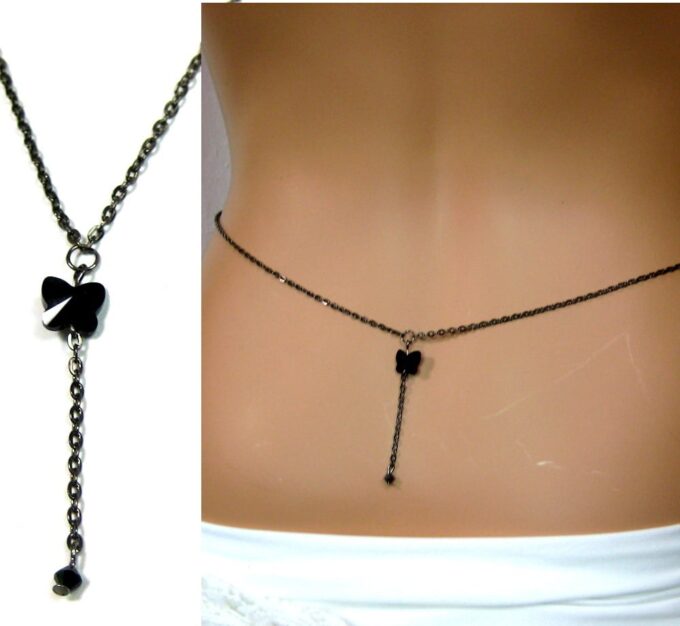 Sensualité et volupté sont à leur paroxysme avec cette Chaine de taille pendentif swarovski noir papillon composée d’un pendentif de forme papillon et d’une petite perle bicone en Cristal de Swarovski noir montés sur une chaine maille forçat miroir en métal noir. Cette Chaîne de taille, aussi appelée chaine de hanche ou chaine de ventre, est terminée par un délicat fermoir mousqueton sûr et facile d’utilisation. Dimentions du papillon : 1 X 1 cm.