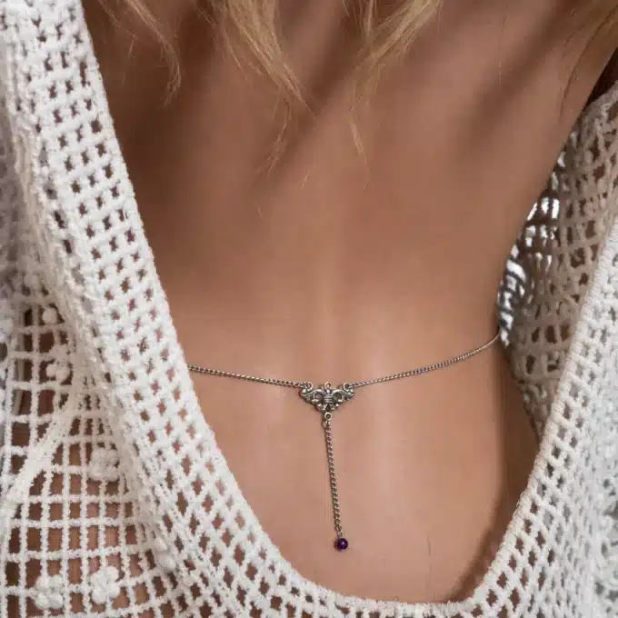Cette chaîne de taille artisanale en acier inoxydable argenté sublime délicatement la silhouette grâce à son design fin et minimaliste. Son élément central triangulaire travaillé en alliage argenté accueille une véritable pierre d’améthyste, suspendue par une chaînette élégante en acier inoxydable qui attire naturellement le regard.