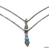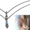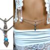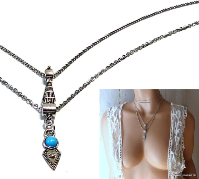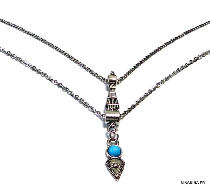 Cette Chaîne de taille, aussi appelée chaine de hanche ou chaine de ventre, est composée d’un pendentif double en métal argenté vieilli et cabochon en howlite turquoise (turkénite) monté sur une double chainette mailles curb et forçat en acier inoxydable et terminée par un fermoir mousqueton sûr et facile d’utilisation. Dim du pendentif : 0,7 X 6,5 cm.