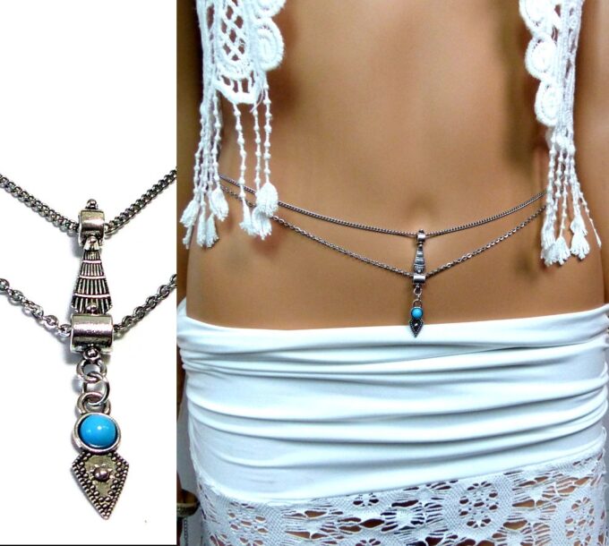 Cette splendide Chaine de taille double rang acier howlite turquoise est exclusivement destiné aux amateurs de gros bijoux! Un bijou ethnique chic aux lignes aussi simples qu’imposantes, qui couvriront une bonne partie de votre ventre! Les inconditionnelles de bijoux voyants en argent trouveront amplement leur bonheur à travers l’exubérance de cette chaine de ventre argentée!