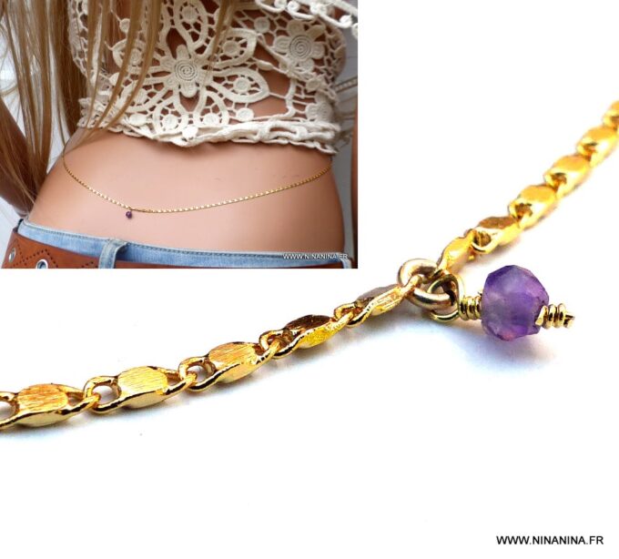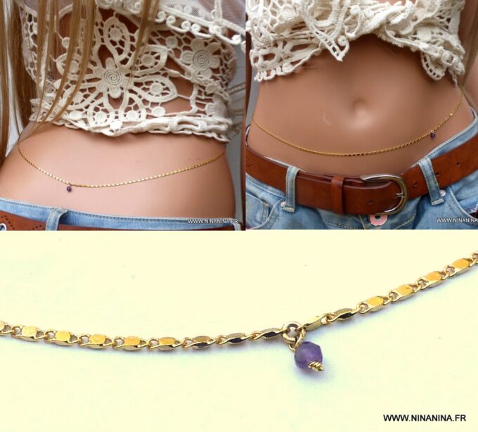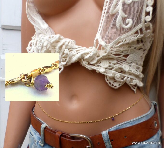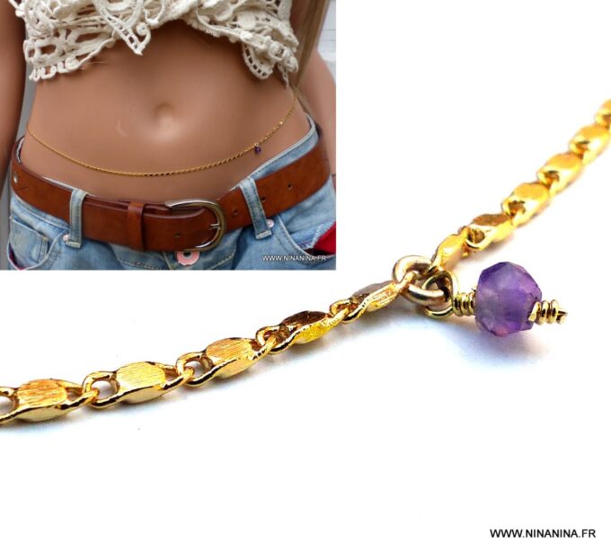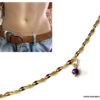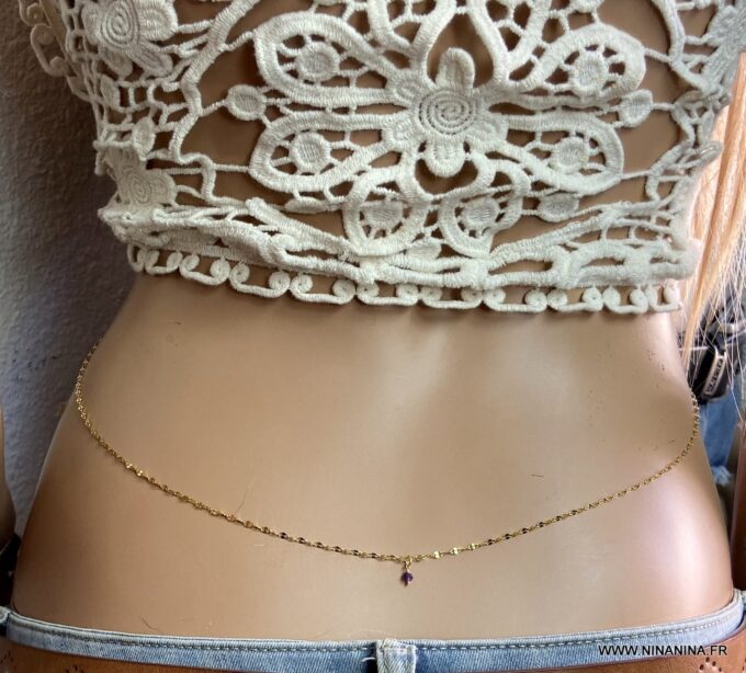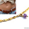 Ajoutez une touche de sensualité à n’importe quelle tenue avec cette Chaine pour taille femme acier doré et perle améthyste naturelle, composée d’une petite améthyste naturelle délicatement montée sur chaine en acier inoxydable doré maille fantaisie. Cette Chaîne de taille doré, aussi appelée chaine de hanches, est terminée par un fermoir mousqueton sûr et facile d’utilisation.