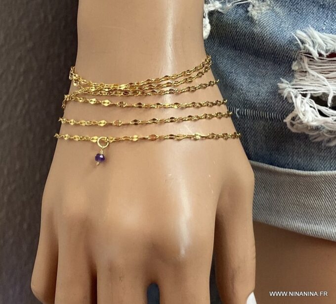 Porte bonheur, talisman, amulette de protection, cette chaine de taille acier inoxydable doré, bijou pierre de naissance original et somptueux, est le cadeau idéal pour les natifs du mois de février car l‘Améthyste est leur Pierre de Naissance. Et retrouvez ici les autres Bijoux Améthyste Ninanina qui viendront parfaire votre look !
