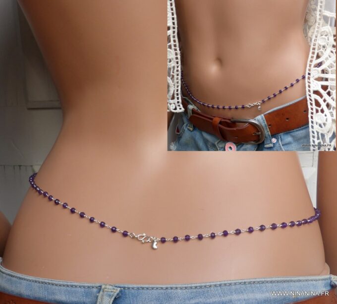 Ajoutez une touche de sensualité à n’importe quelle tenue avec cette Chaine taille Argent 925 infini et Améthystes composée de petites pierres brutes en Améthyste naturelle montées sur fil Plaqué Argent et d’une petite breloque Croissant de Lune en Argent 925. Cette Chaîne de ventre, aussi appelée chaine de hanches ou chaine de ventre, est terminée par un fermoir rond à ressort ou infini en argent 925 au choix.