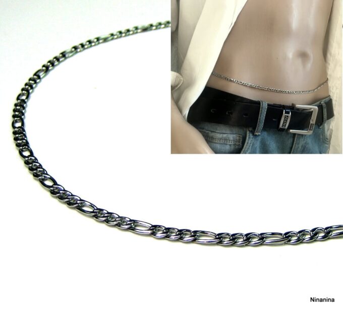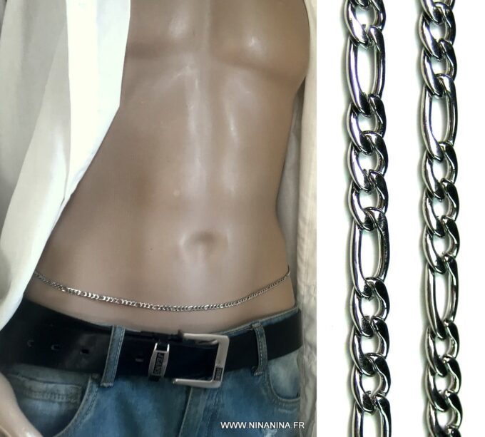 N’ayez pas peur de vous exprimer avec cette Chaine de taille homme acier inoxydable maille figaro en acier inoxydable argenté. Cette Chaîne de taille, aussi appelée chaine de hanche ou chaine de ventre, est terminée par un délicat fermoir mousqueton, facile d’utilisation.