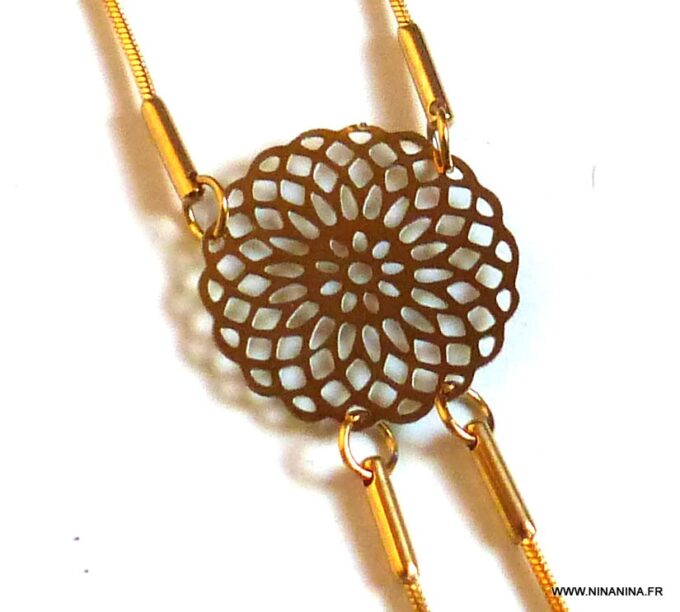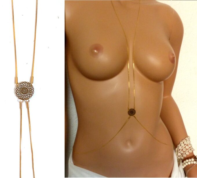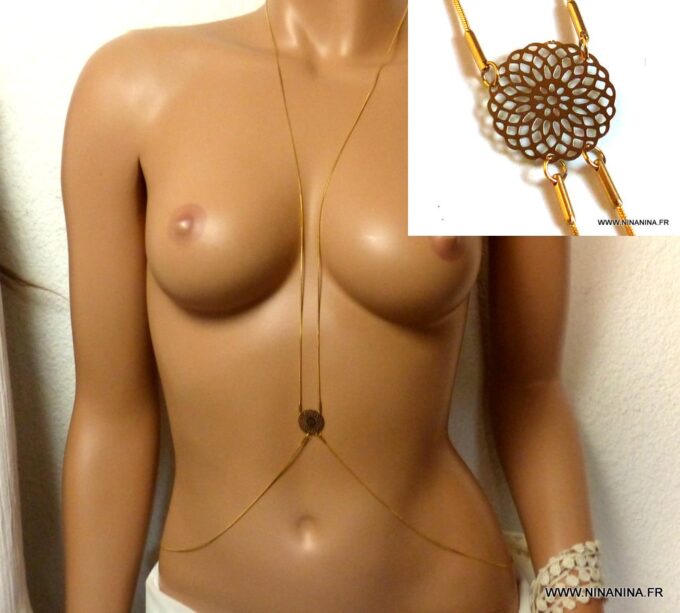 Une rosace dorée filigranée, une chainette maille serpent ronde qui courre de votre cou à votre dos en passant par votre taille, cette Chaine de corps acier inoxydable plaqué or très originale ne manquera pas de vous séduire !