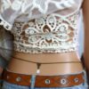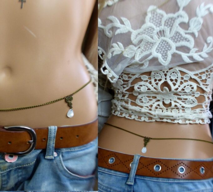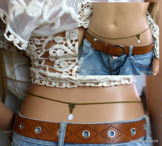 Chaine de taille métal bronze et pendentif goutte nacre blanche composée d’une arabesque en métal bronze et d’une petite pétale de nacre blanche montées sur chainette en métal bronze.