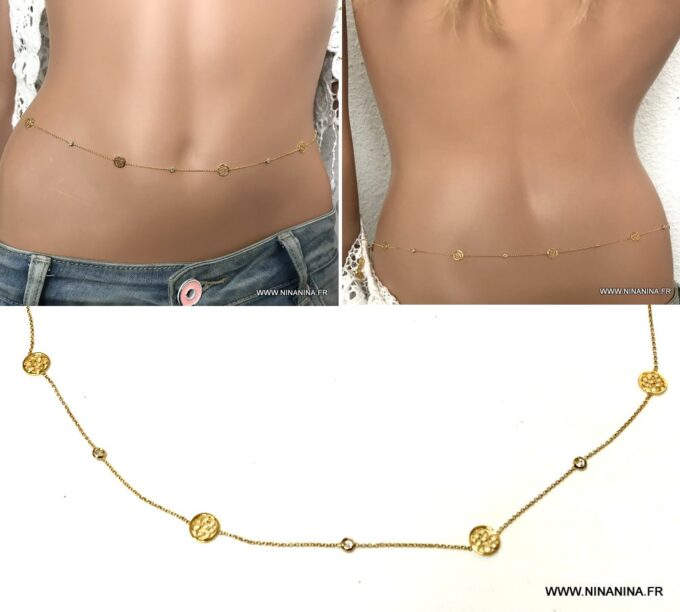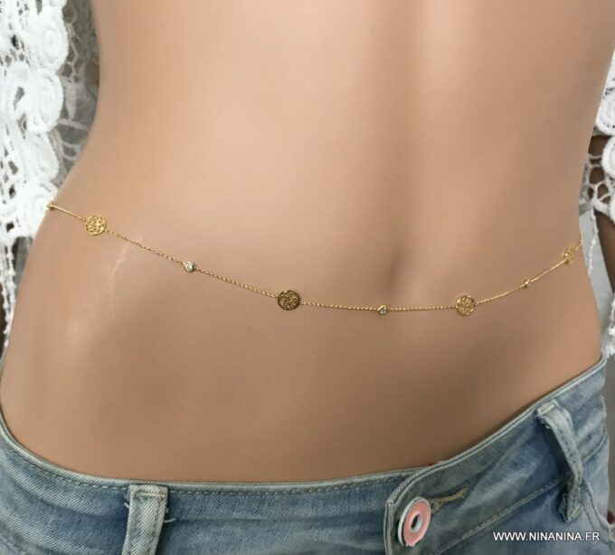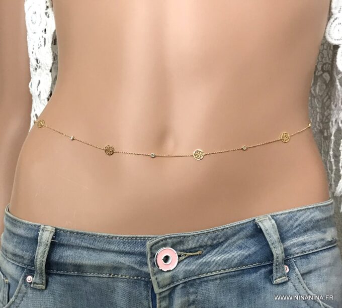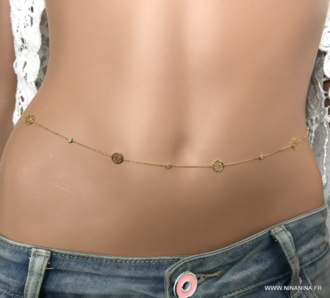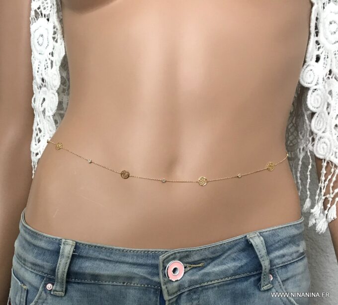 A porter aussi bien pour accessoiriser de la plus belle des manières une tenue de plage, un bikini, ou des sous-vêtements en dentelle, la chaîne de taille, appelée également chaîne de ventre ou chaîne de hanches est un bijou peu commun, qui se révèle d’une finesse et d’un raffinement exquis!