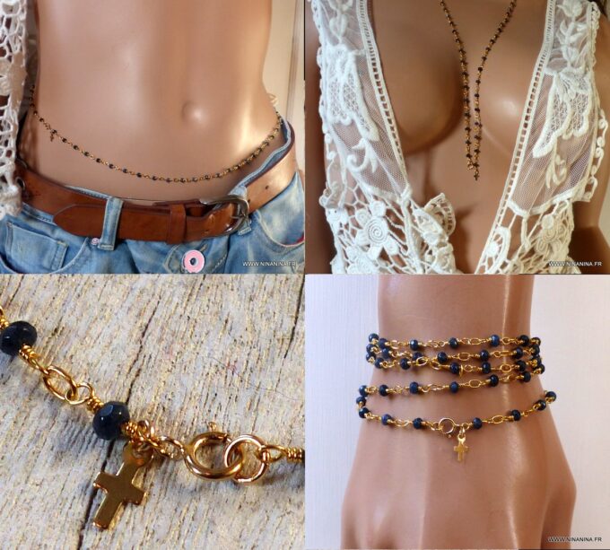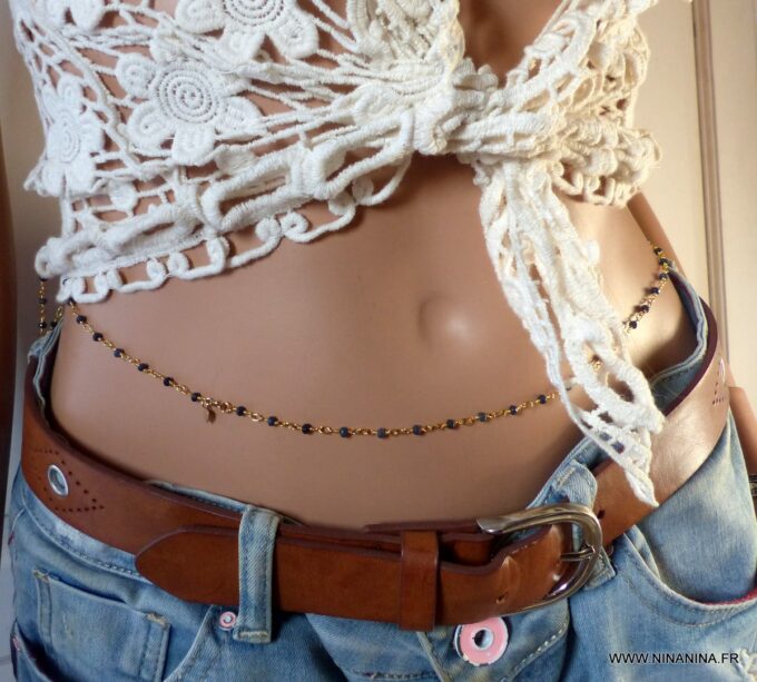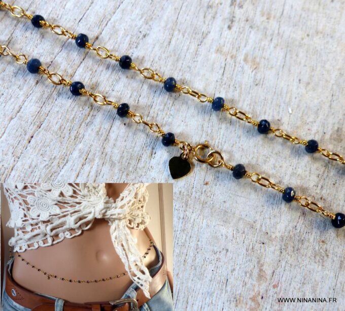 Ce magnifique bijou avec pierre saphir de grande qualité est unique et fabriqué à la main, de façon artisanale et en série limitée dans notre atelier du sud de la France. Il s’agit d’un Bijou fait sur mesure et pour éviter tout souci de taille, merci de mesurer la zone en dessous de votre nombril ou celle sur laquelle vous souhaitez poser la chaîne. Sélectionnez ensuite la longueur de votre chaîne dans le menu déroulant : 80 cm env (tailles 36 à 38) – 90 cm env (tailles 40 à 42) ou 100 cm env (tailles 44 à 46) ou ou indiquez en commentaire une longueur intermédiaire.
