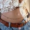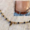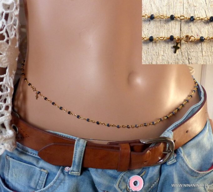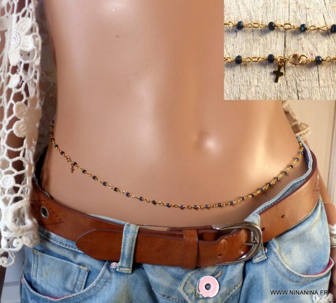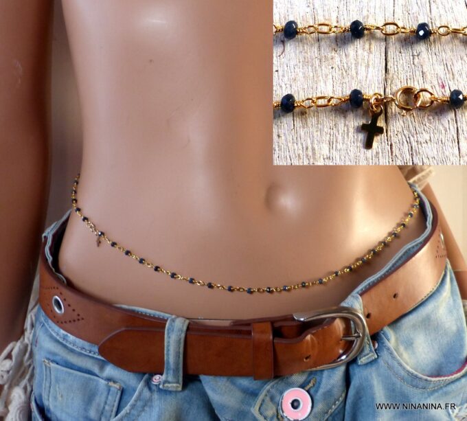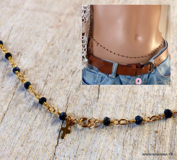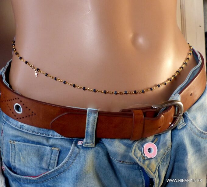 Ajoutez une touche de sensualité à n’importe quelle tenue avec cette Chaine ventre femme pierre de naissance septembre Saphir bleu, constituée d’une petite breloque forme croix en Plaqué Or 14 carats gold filled montée sur un chapelet de pierre saphir brut sur fil Plaqué Or. Cette Chaîne de ventre pierre de naissance septembre, aussi appelée chaine de hanches ou chaine de ventre, est terminée par un fermoir rond à ressort sûr et facile d’utilisation.