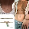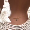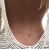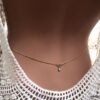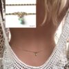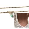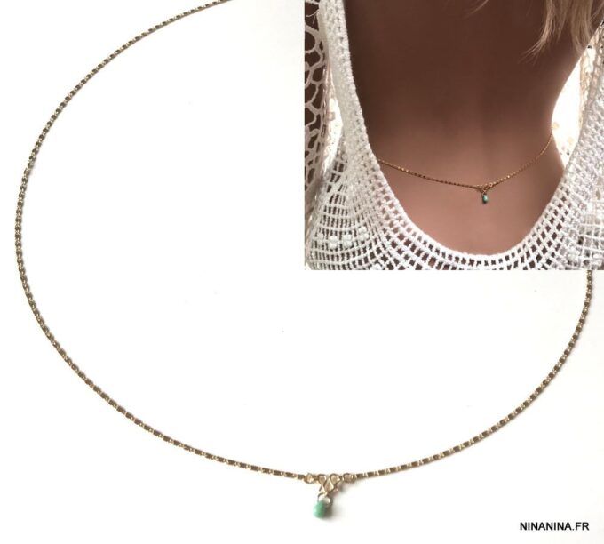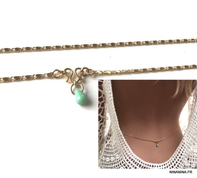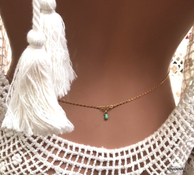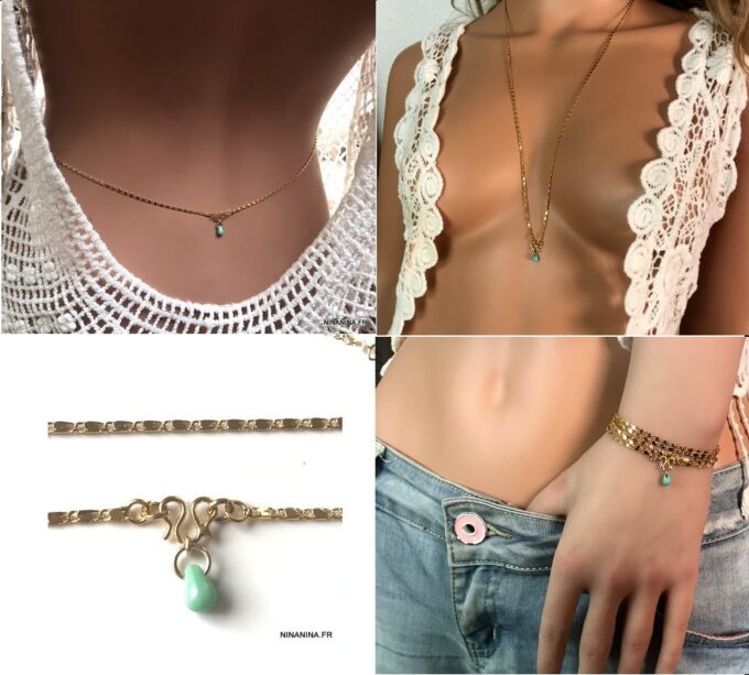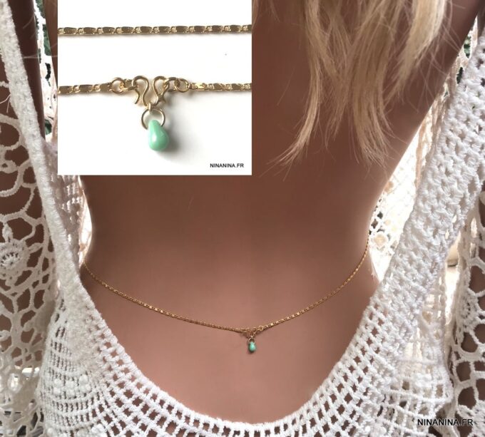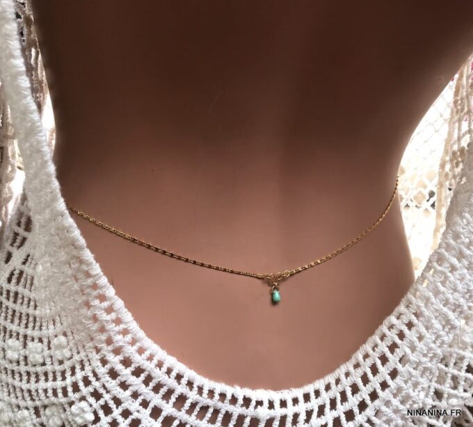 Chaine de taille maille fantaisie Or et goutte turquoise composée d’une chainette fantaisie en plaqué or 9 carats et d’une petite goutte de verre turquoise.