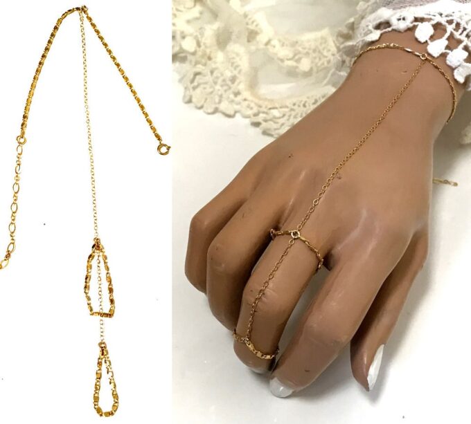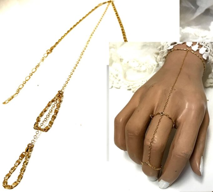 Splendide, originale et délicate, cette Chaine doigt main plaqué or – Bracelet bague femme se compose d’une chaînette en plaqu&é or 9 carats et plaqué or 14 carats gold filled qui court le long du doigt pour rejoindre le poignet. Une chainette d’ajustement termine magnifiquement ce bijou de main et permettra de régler le bracelet à différentes longueur.