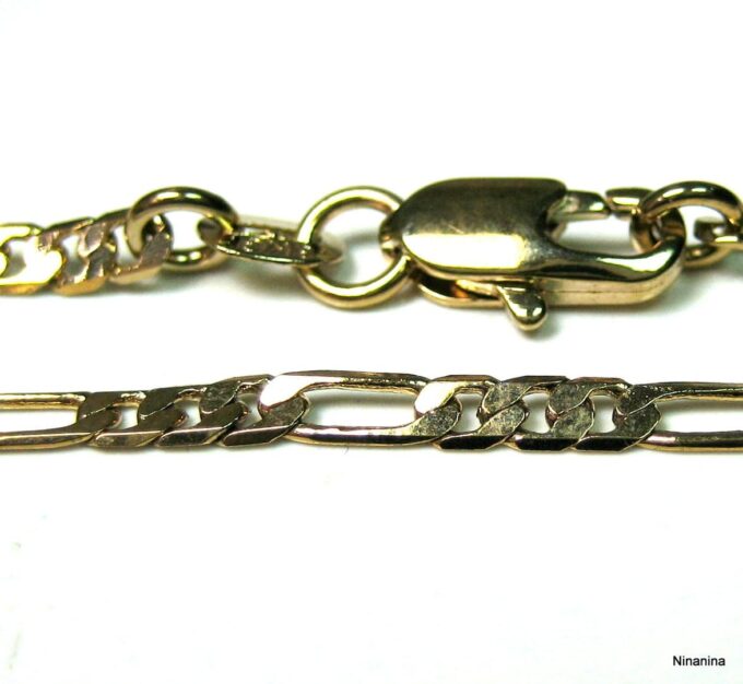 Cette chaine plaqué or femme et homme en plaqué or 9 carats maille figaro mesure 45 cm et 2 mm de large. Cette chaine délicate se termine par un fermoir mousqueton très facile d’utilisation. Le plaqué or 9 carats est composé de 37,5% d’or pur, ou décrit comme 9K (375°/00). Il consiste en un dépôt d’une fine couche d’or de 1 micron sur une surface d’un métal commun (laiton, cuivre…) par galvanoplastie.