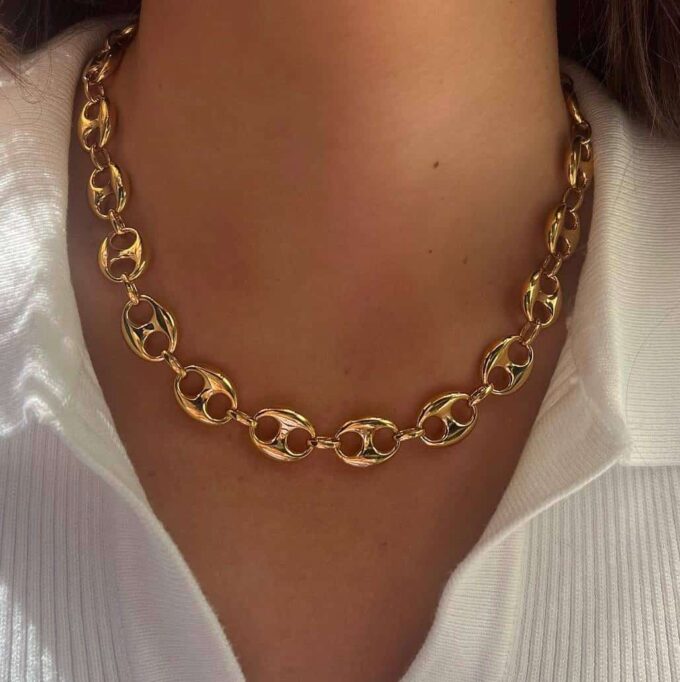Cette imposante Chaîne grain de café gros maillon femme Acier doré ne pourra que vous séduire! Ce collier en acier inoxydable doré se compose de maillons de 11mm de large en forme de grain de café. Un fermoir mousqueton sûr et facile d’utilisation termine le tout pour un ajustement parfait sur votre cou.