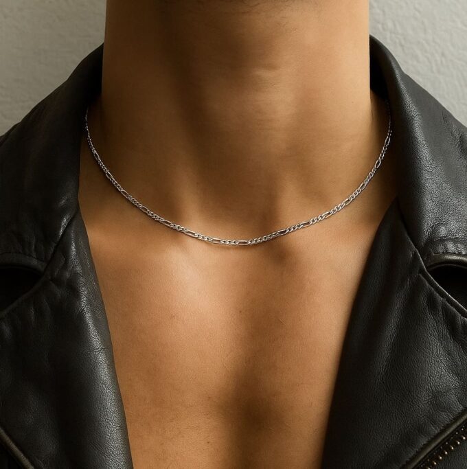 La maille Figaro, composée de trois petits maillons suivis d’un grand, confère à cette chaîne un rythme harmonieux et raffiné.