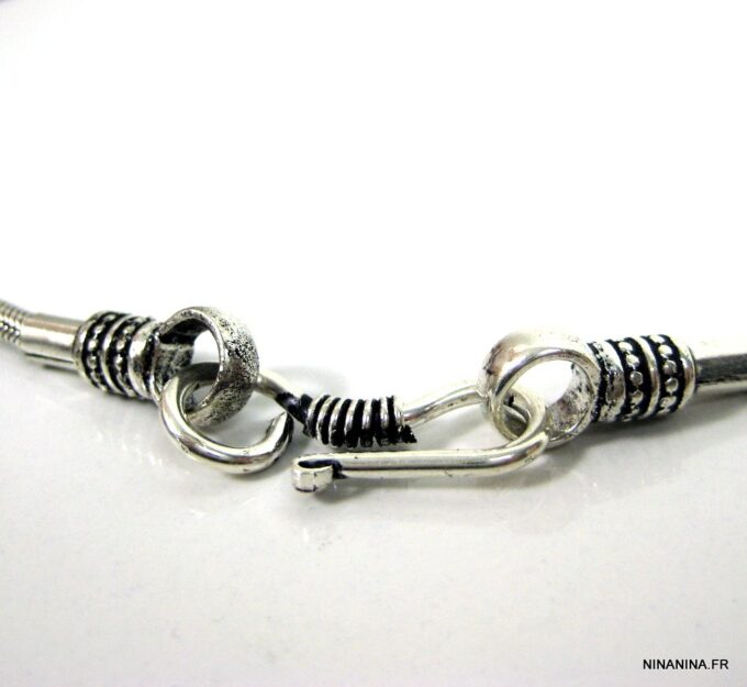 Le fermoir crochet travaillé à la main ajoute une note artisanale et tribale qui renforce le charme du bijou. Une pièce forte qui allie tradition et modernité.