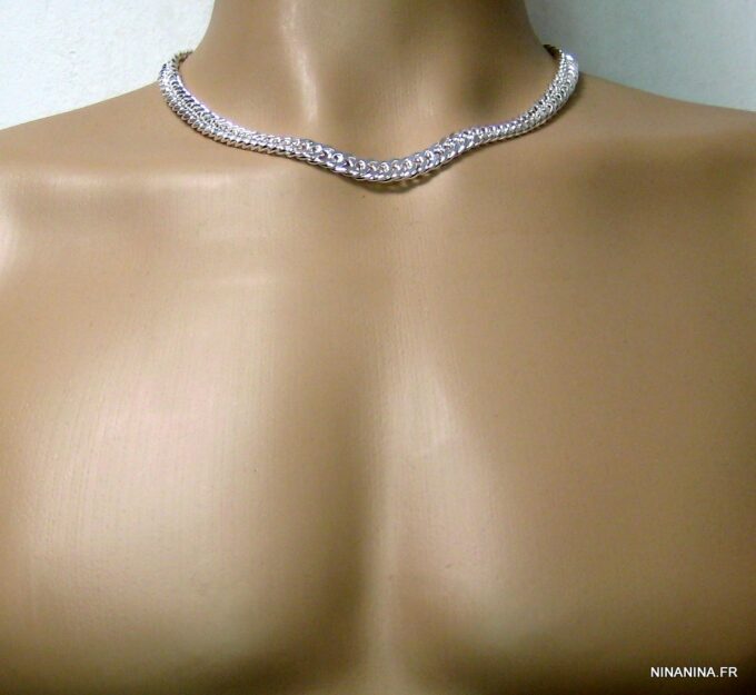 Chaine homme maille gourmette Plaqué Argent. Maille gourmette. Largeur : 10 mm. Longueur (fermoir compris) : 55 cm environ. Fermoir mousqueton. Livré dans sa pochette d’organza.