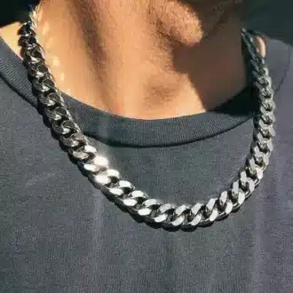 Envie de vous offrir une Chaîne sobre, basique et robuste ? Cette Chaine maille gourmette homme Acier inoxydable argent très résistante est constituée de mailles de 12 mm de large et se porte en ras de cou.