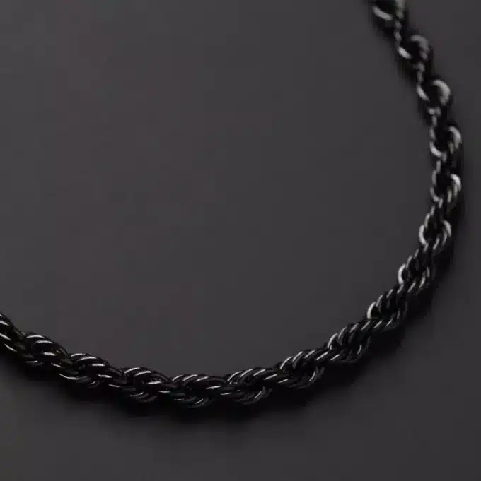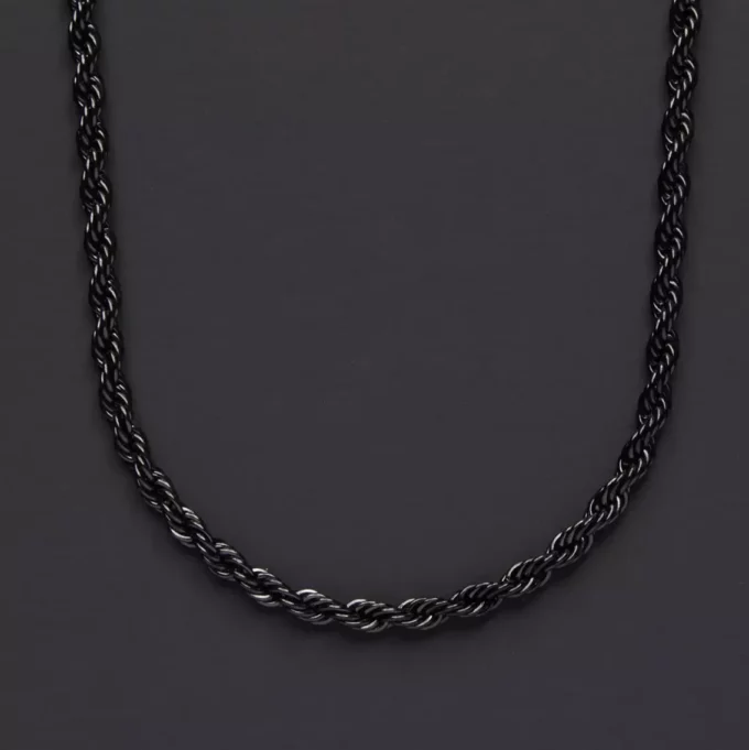 Cette chaîne maille corde pour hommes est fabriquée en acier inoxydable chirurgical noir de haute qualité et terminée par un fermoir mousqueton sûr et facile d’utilisation. Elle saura séduire à coup sûr les amateurs de colliers masculins solides !
