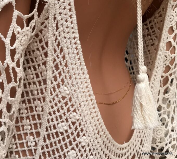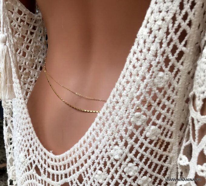 Astuce Ninanina : Vous pouvez également l’accrocher à votre cou et le transformer ainsi en collier sautoir ou en ras de cou en faisant deux tours. Enroulée autour de votre poignet, elle deviendra un bracelet collier ultra tendance qui fera des envieux! Transformez-là en chaine de dos, une façon très originale de porter ce magnifique bijou multifonctions aussi unique que vous l’êtes !