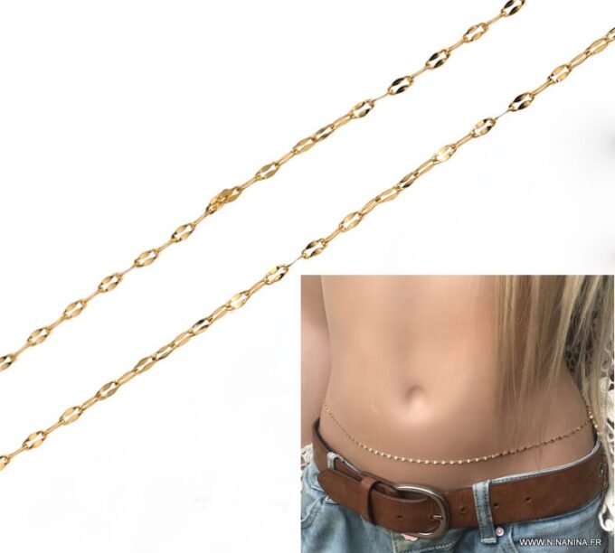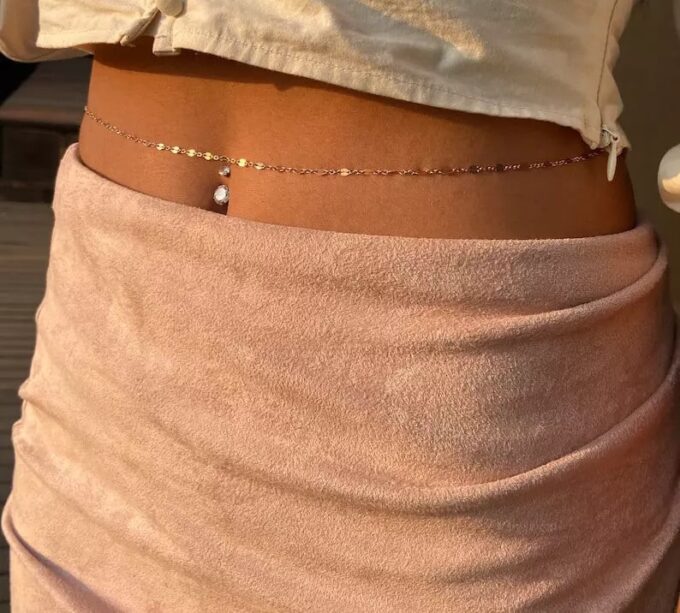 A porter aussi bien pour accessoiriser de la plus belle des manières une tenue de plage, un bikini, ou des sous-vêtements en dentelle, la chaîne de taille, appelée également chaîne de ventre ou chaîne de hanches est un bijou peu commun, qui se révéle d’une finesse et d’un raffinement exquis!