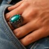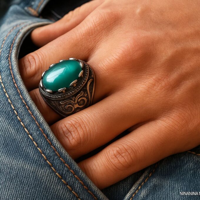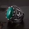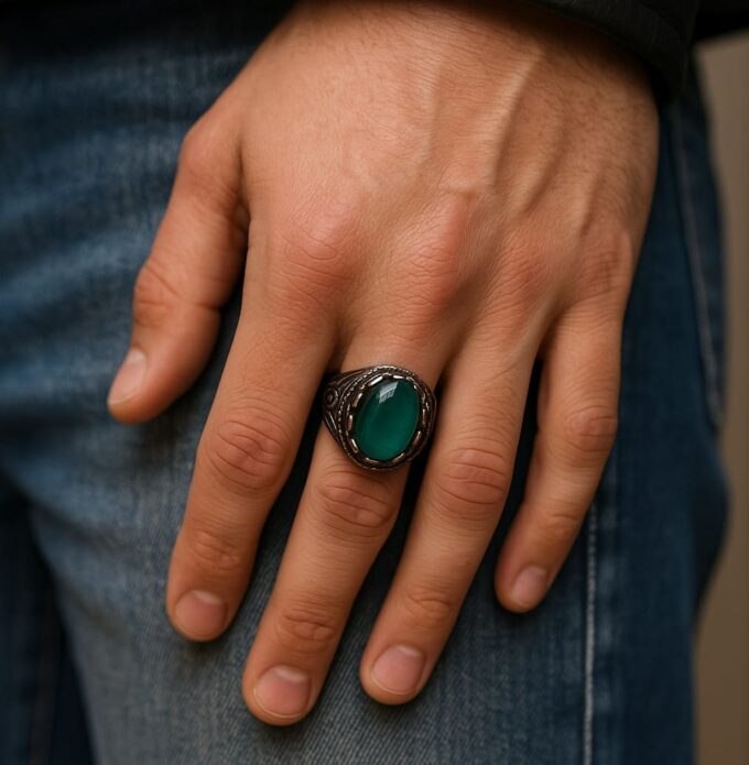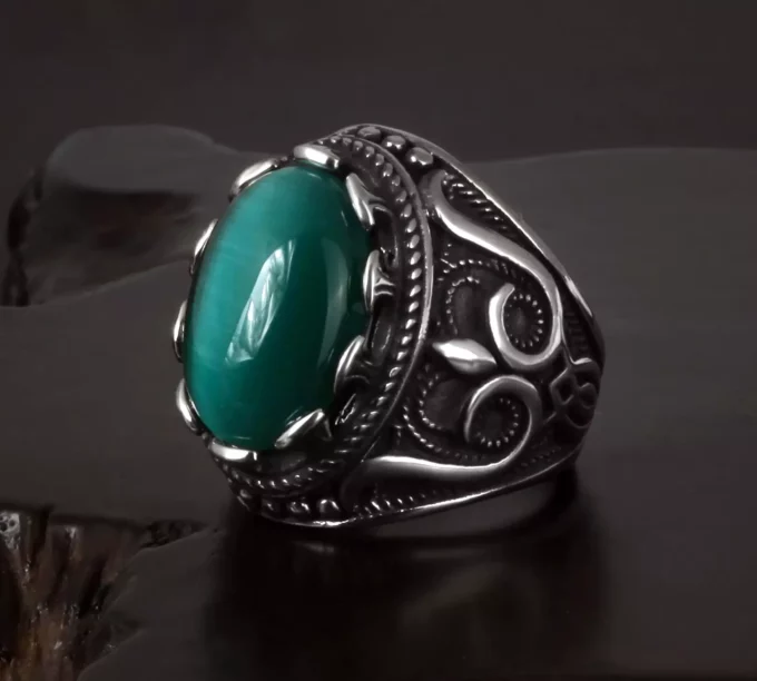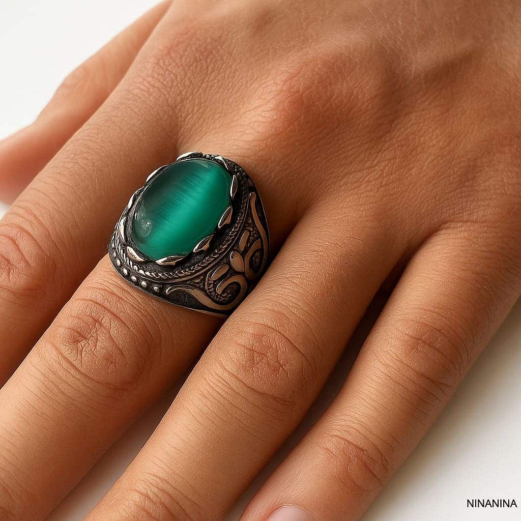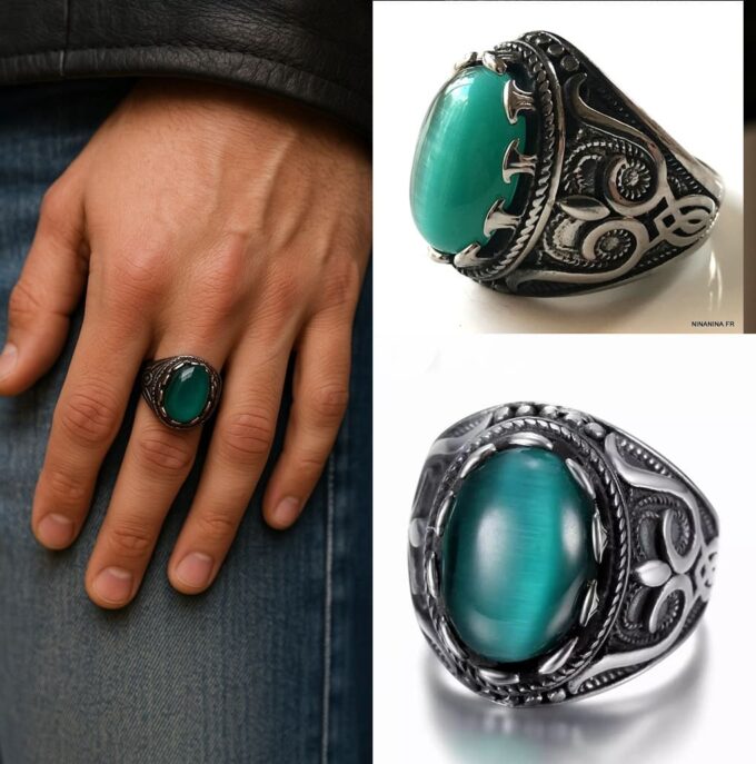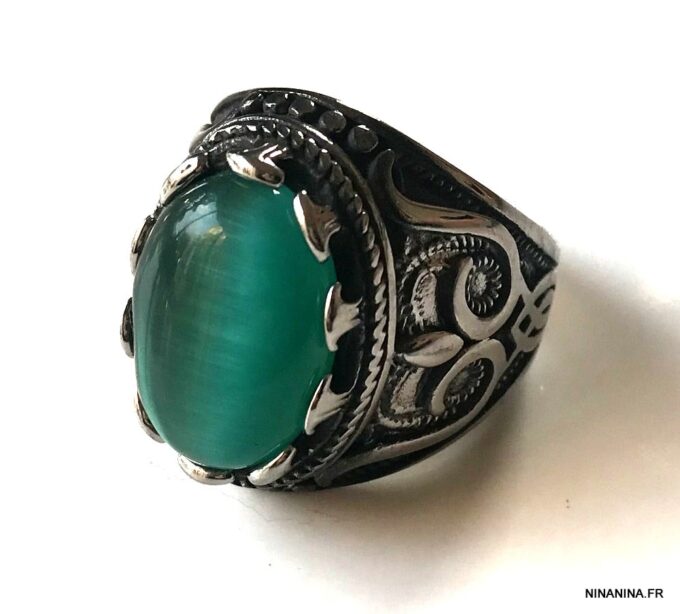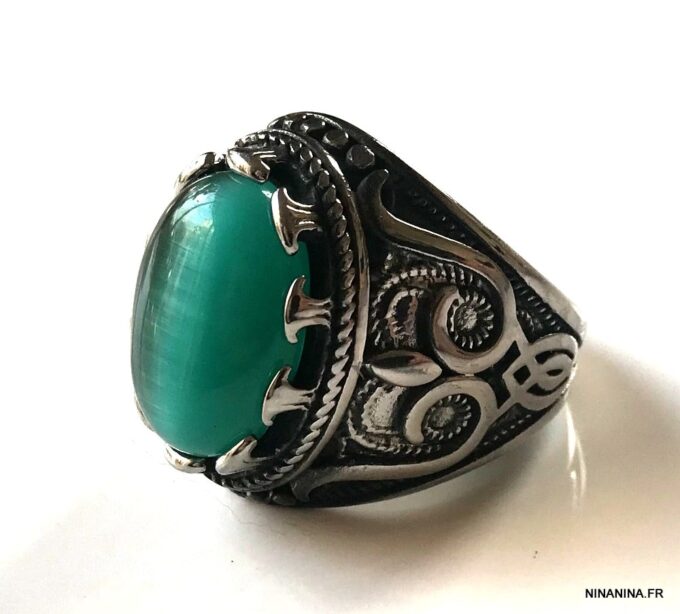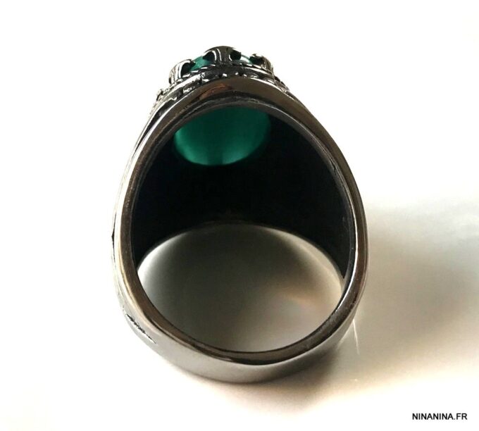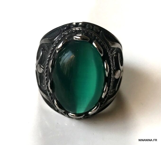 Look intemporel et énergie mystique pour cette bague masculine massive, arborant une pierre ovale en onyx vert de 2 cm de hauteur, un bijou pour amateurs de bijoux masculins qui vous apportent bien plus qu’une simple beauté esthétique!