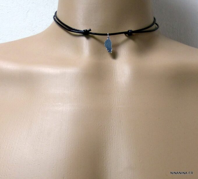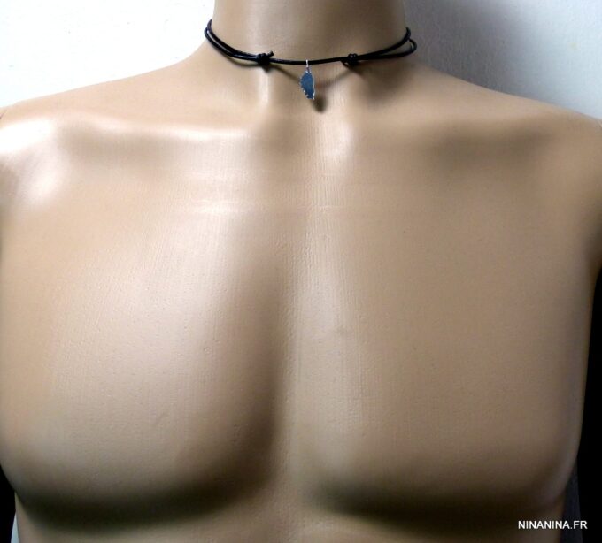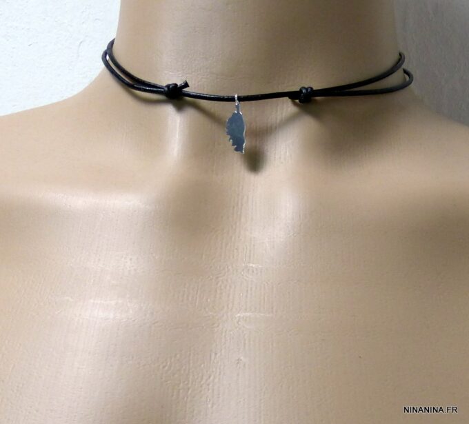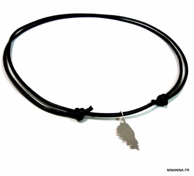 Collier homme cordon cuir CORSE argent massif composé d’un pendentif CORSE en argent 925 monté sur un cordon de cuir noir (2 mm de diamètre).
