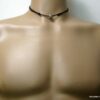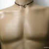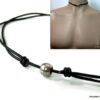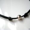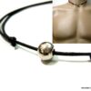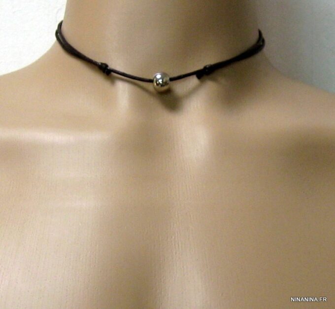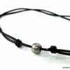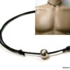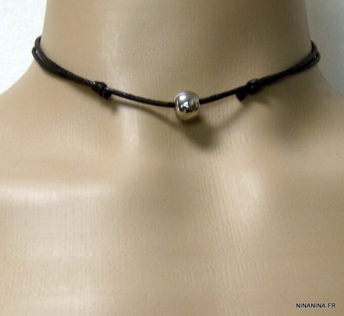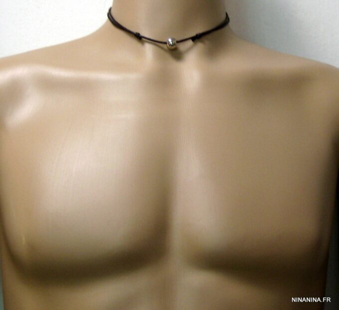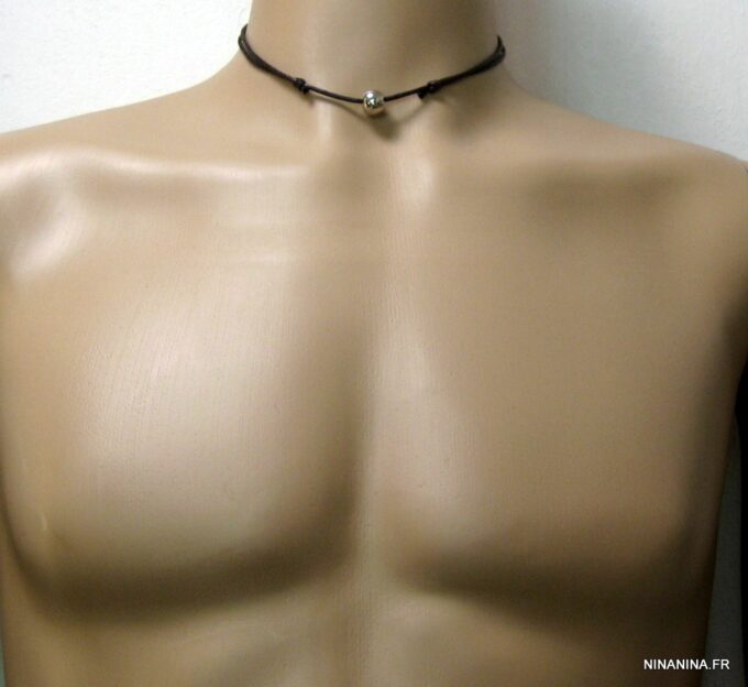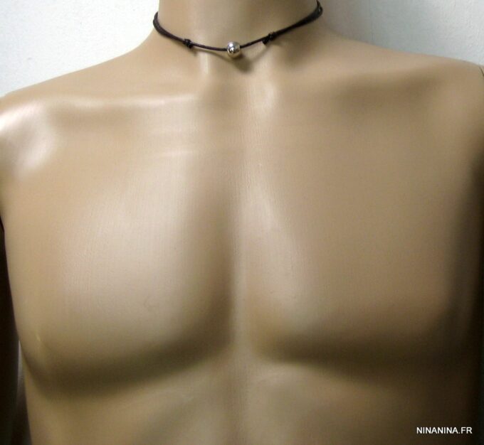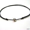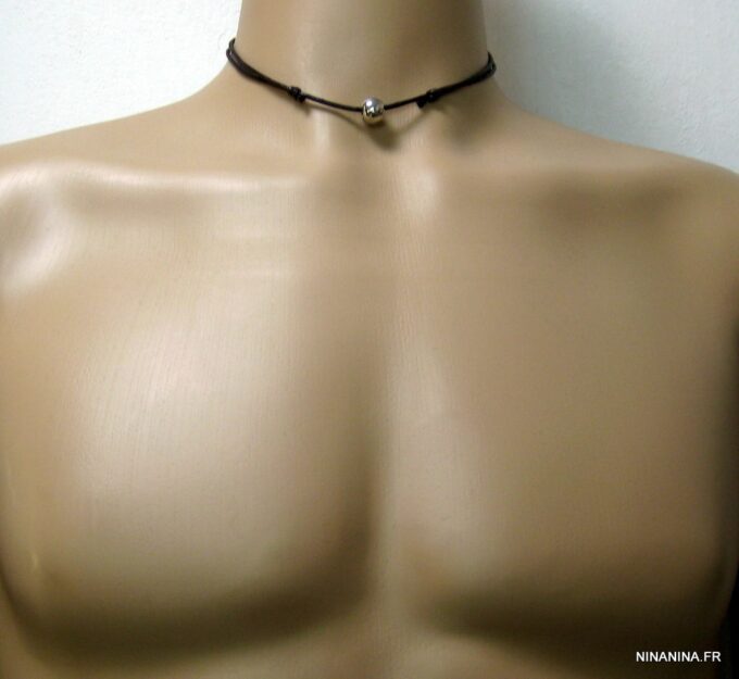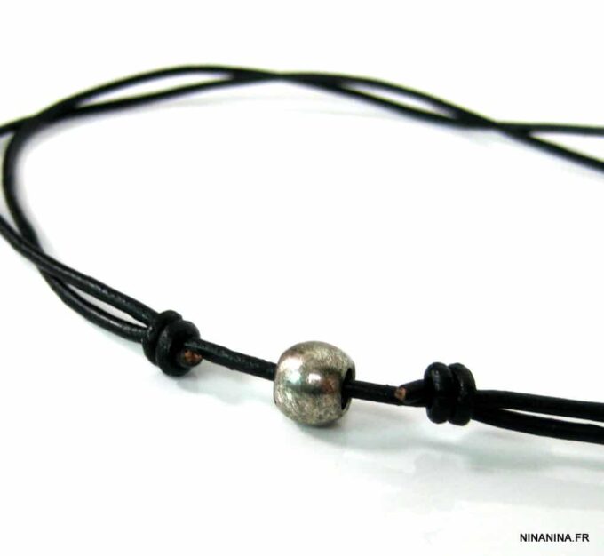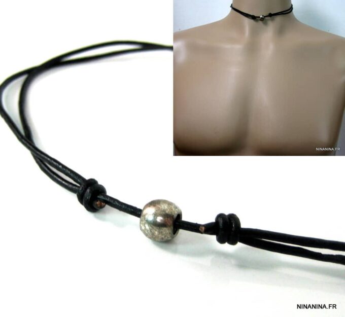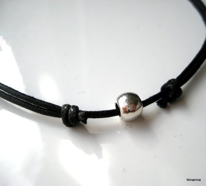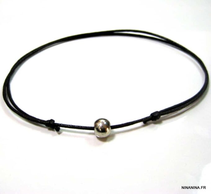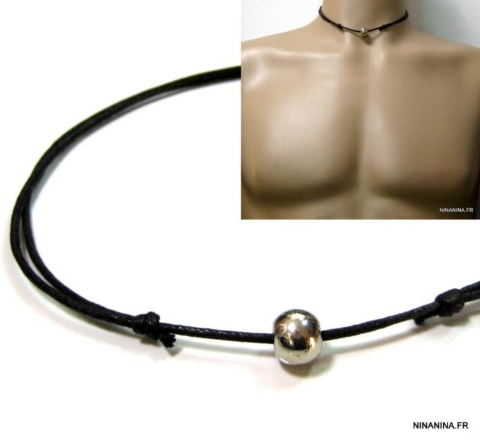 Collier homme cordon coton ciré métal argenté composé d’une perle cylindrique en métal argenté montée sur un cordon de coton ciré noir (2 mm de diamètre).