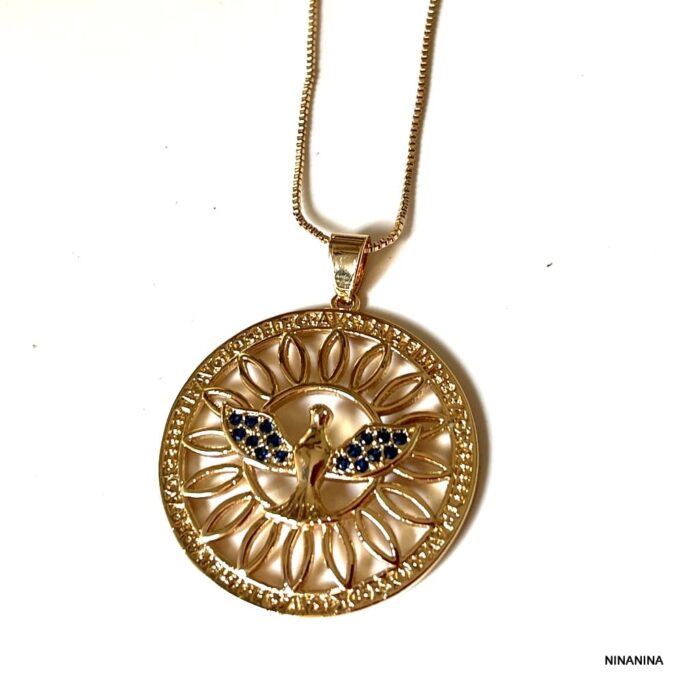 Le pendentif rond ajouré dévoile un aigle en plein envol, mis en valeur par de délicates pierres en zirconium bleu. Un contraste élégant entre finesse et éclat.