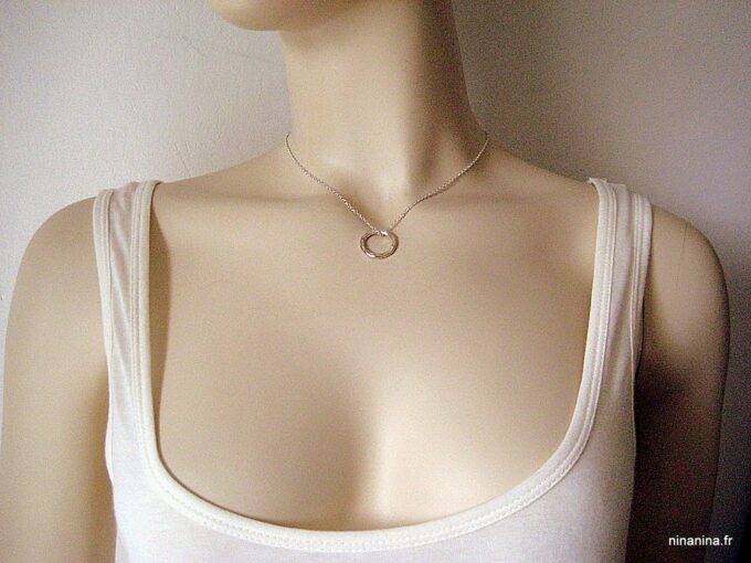 Collier argent 925 anneau martelé composé d’un anneau martelé en argent 925 monté sur une chaînette en argent 925. Diamètre de l’anneau : 1,8 cm env. Fermoir rond. Longueur (fermoir compris) : 40 cm env. Livré dans sa pochette d’organza.