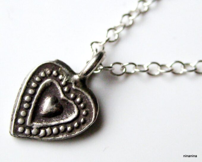 Son pendentif en forme de cœur présente un relief travaillé à la main, mêlant brillance et texture pour un rendu élégant et authentique.