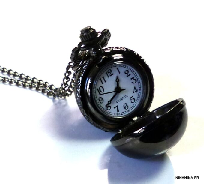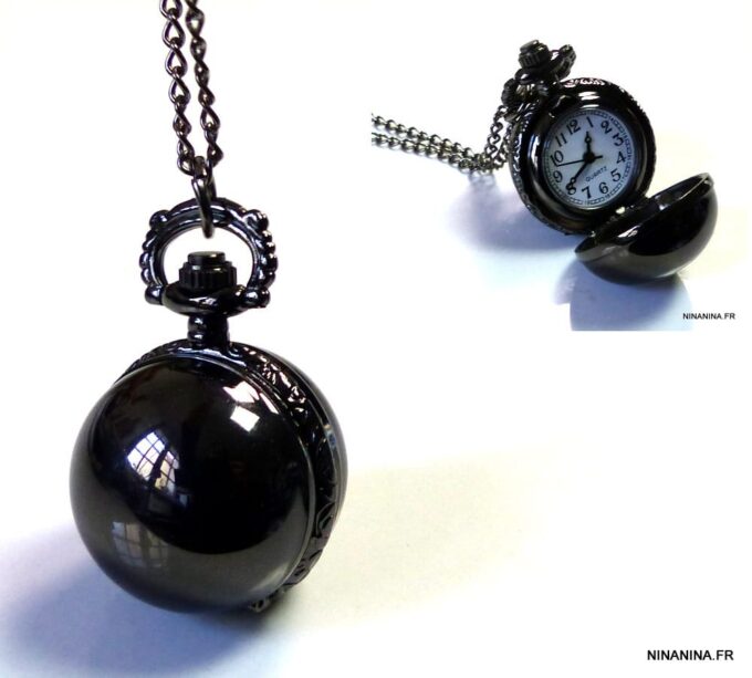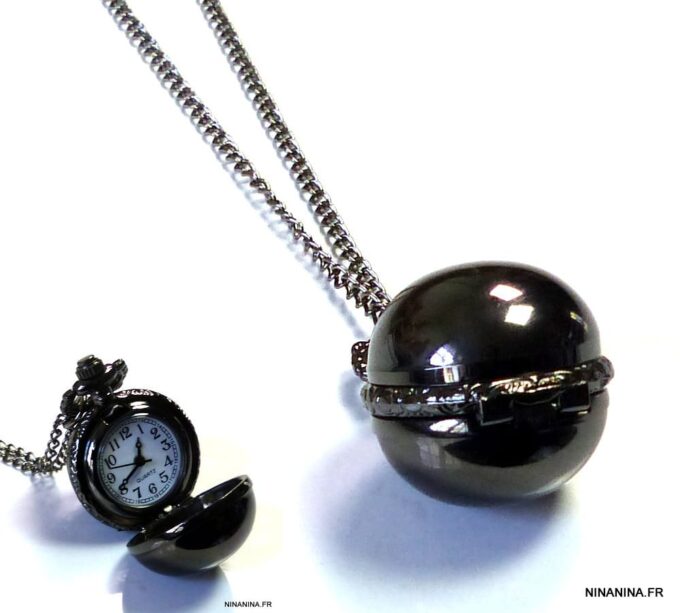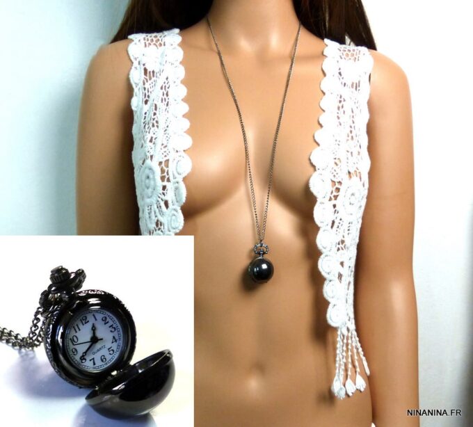 Vous rêvez d’une montre qui sort de l’ordinaire ? Découvrez la montre collier ou gousset, ninanina. Pour vous qui êtes à la recherche d’un collier original, ce collier sautoir en métal noir et son pendentif montre gousset va vous taper dans l’oeil! Un accessoire vintage tout en élégance à porter avec une tenue hippie chic! Succombez à la montre sautoir !