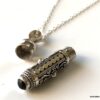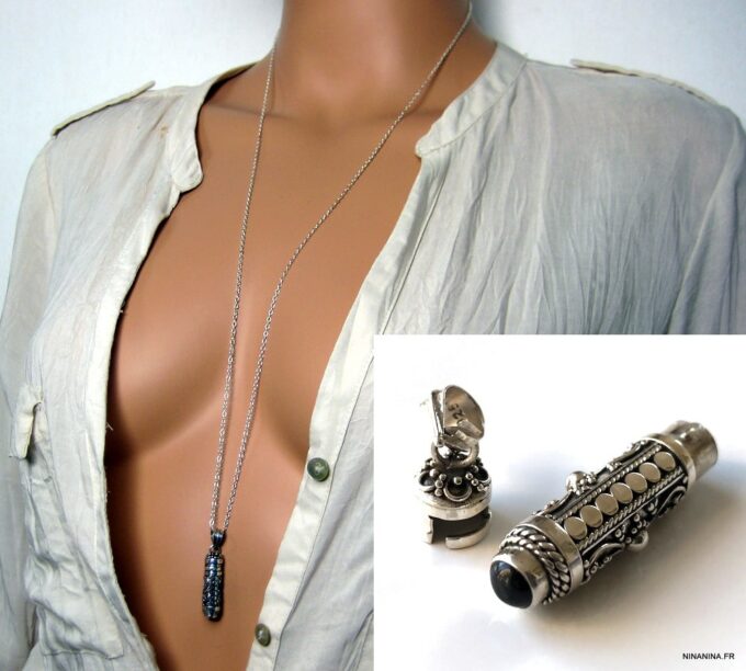 Découvrez le Collier cendre funeraire pendentif Argent 925 Et Onyx noir composé d’un pendentif cylindrique en argent 925 ciselé et serti d’une pierre en Onyx noir véritable, monté sur une chaînette maille forçat en argent 925.
