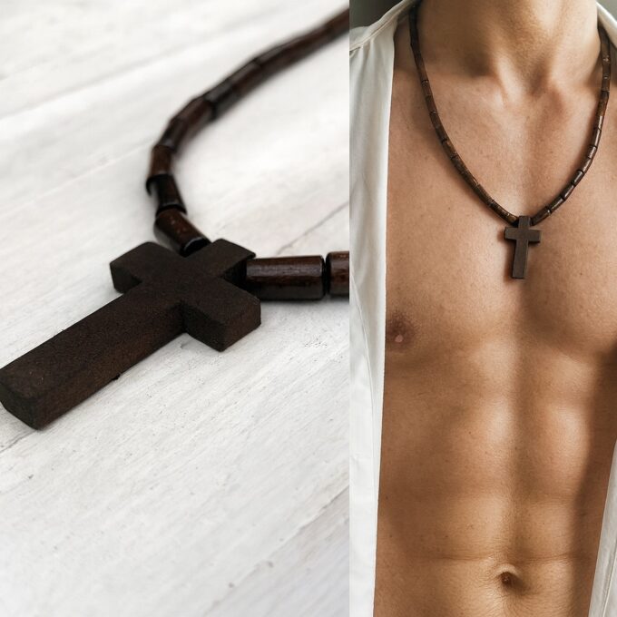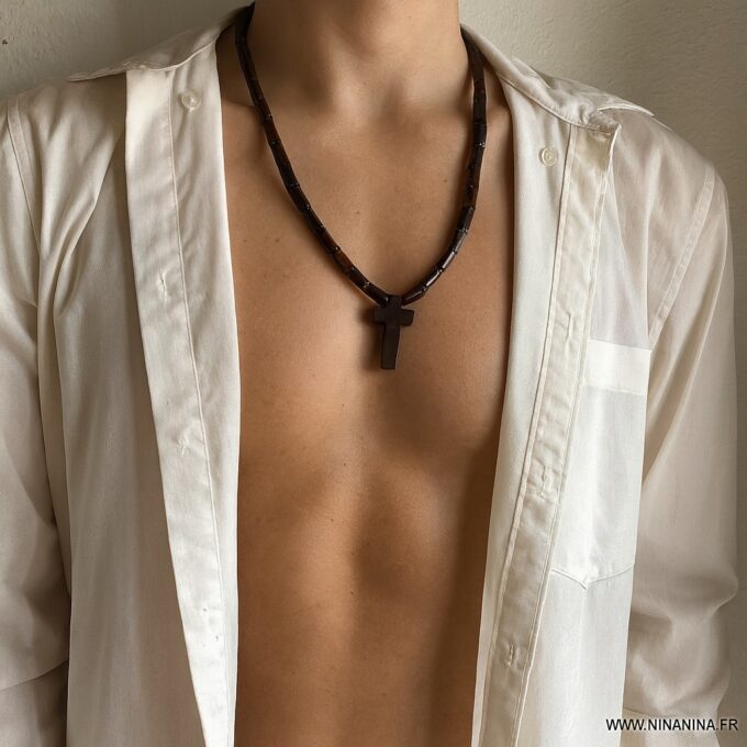 Le collier croix en bois homme présenté ici est conçu pour ceux qui recherchent à la fois un bijou spirituel et un accessoire esthétique. Ses perles cylindriques marron, plus originales que les perles rondes classiques, confèrent au collier un style unique et très masculin.