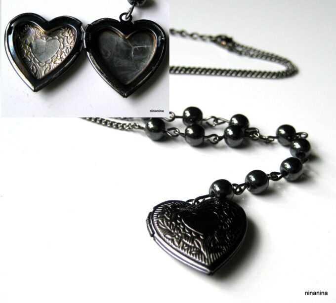 Collier lasso perles coeur métal noir porte photo composé d’un pendentif coeur porte-photo en métal noir monté sur chapelet de perles noires et fine chainette en métal noir.
