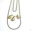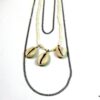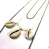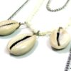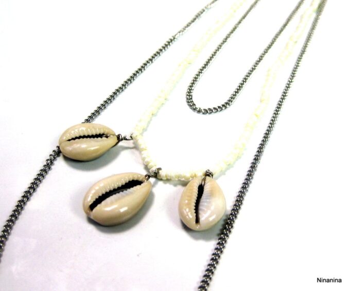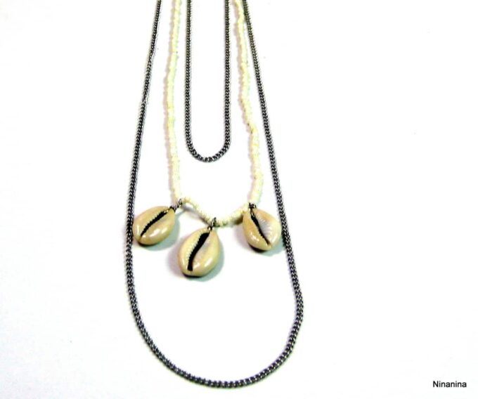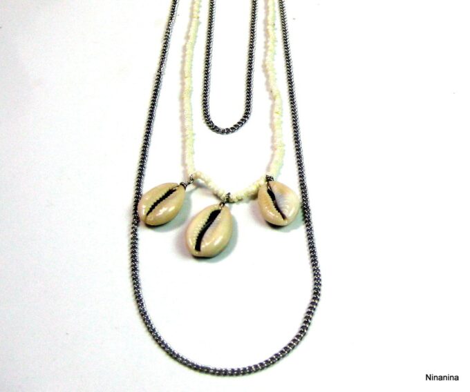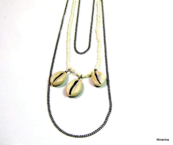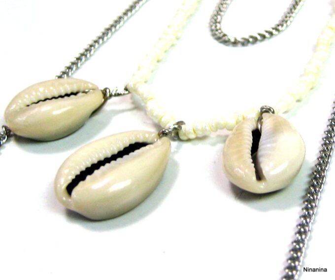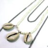 0Collier cauri coquillage femme et acier inoxydable composée de 3 coquillages cauris, appelés aussi coquillages grain de café blanc montés sur un rang de rocailles blanches et chainette en acier inoxydable.