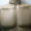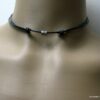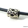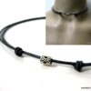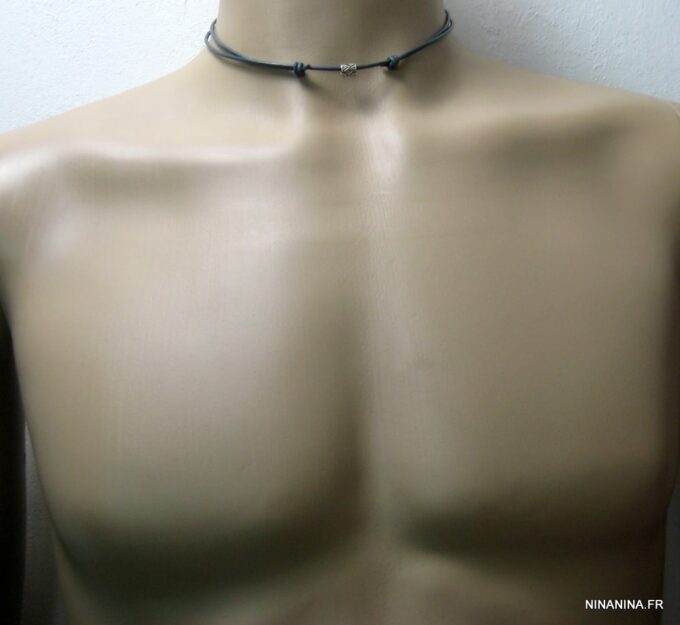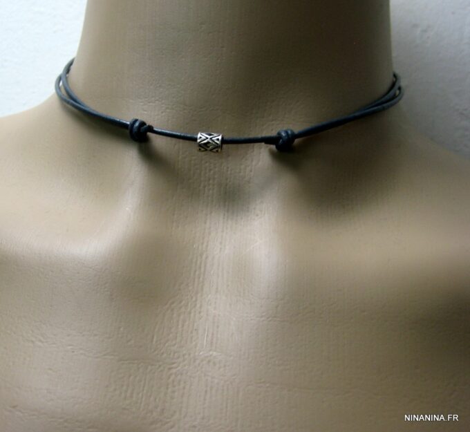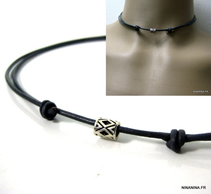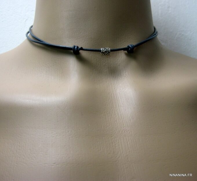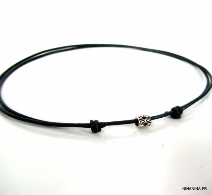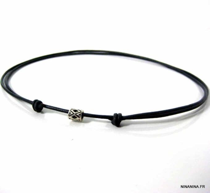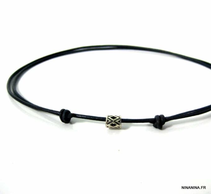 Collier cordon cuir minimaliste perle tube Argent 925 composé d’un tube ciselé en argent 925 monté sur un lacet de cuir gris (2 mm de diamètre).