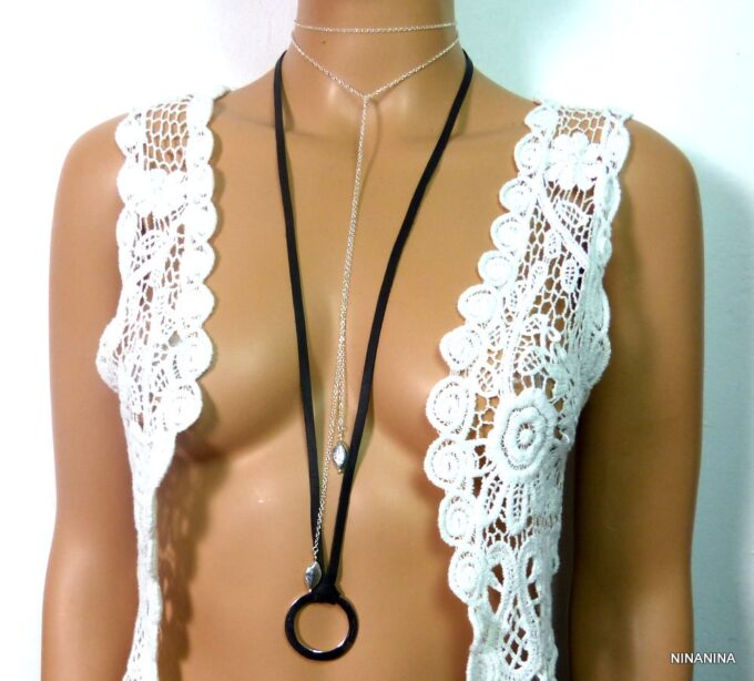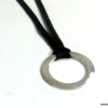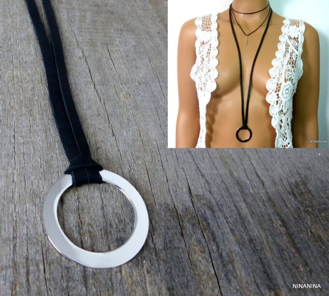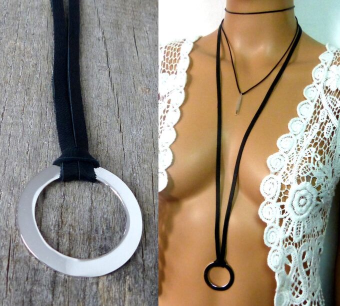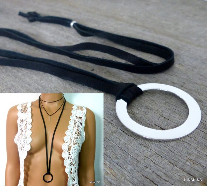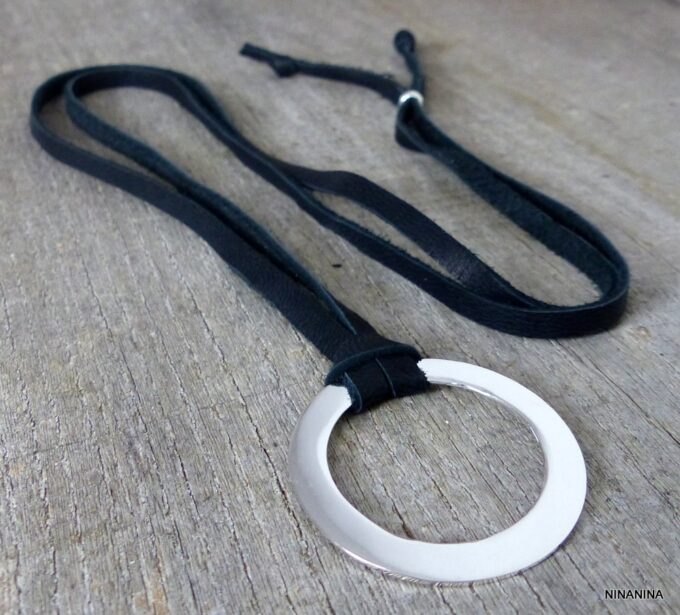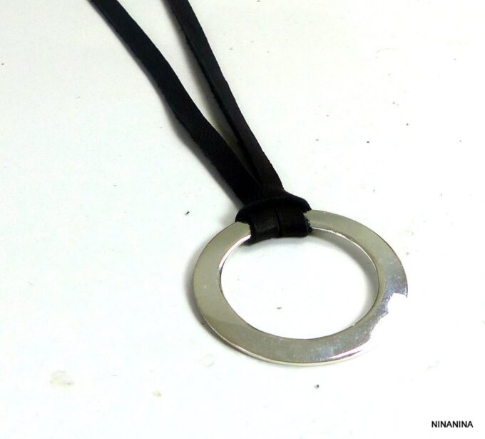 Collier femme anneau argent plaqué lacet daim composé d’un anneau rond en plaqué argent monté sur un lacet de daim noir (5 mm de large).