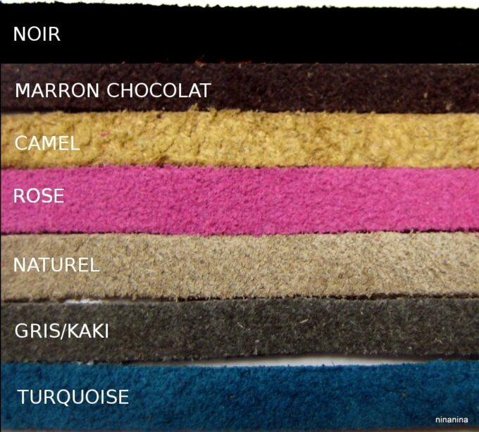 Bleu marine, Caramel, Gris/kaki, Marron chocolat, Naturel, Noir, Rose, Rouge, Turquoise